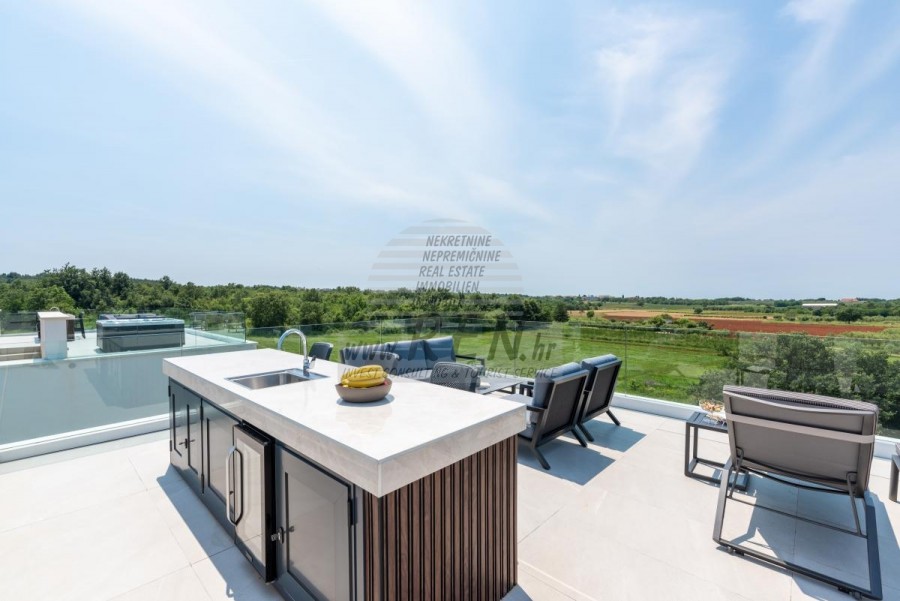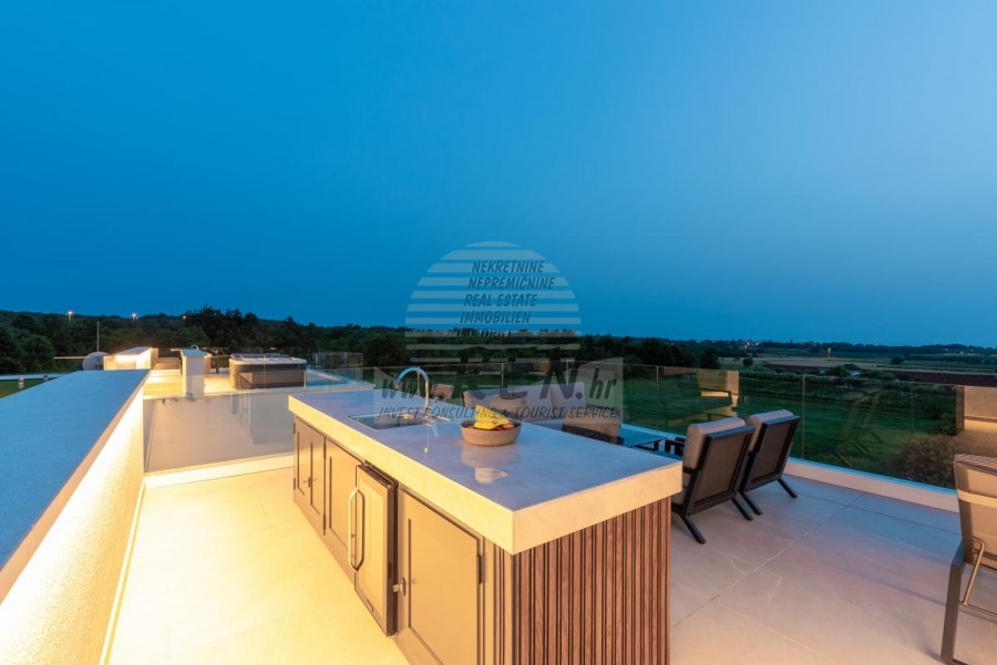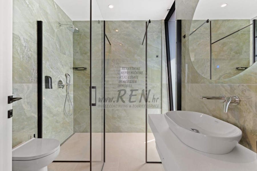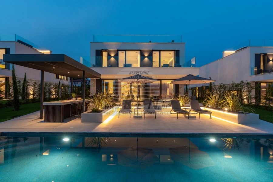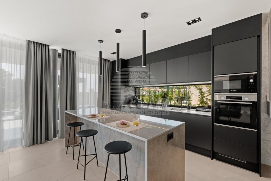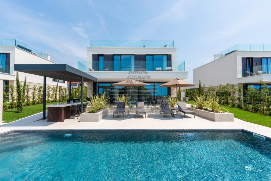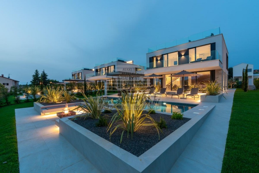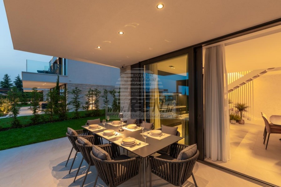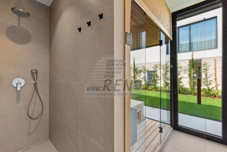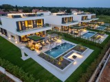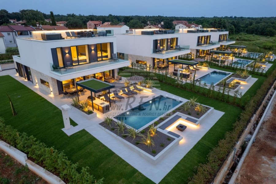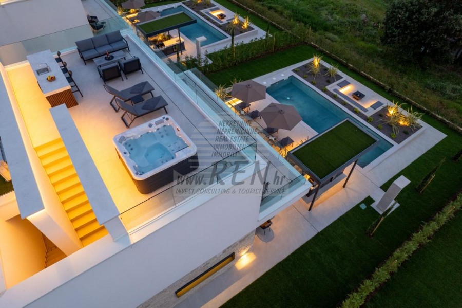Il complesso di ville si trova su una superficie di 3730 m2. Si compone di 4 edifici indipendenti, completamente arredati e attrezzati con vista sul mare aperto. Metratura lorda di ciascuna abitazione: 270 mq (contano solo le superfici chiuse) Superficie residenziale netta interna: 204 mq (parte chiusa) Netti, aperti coperti e scoperti: 310 mq (lettino prendisole, tettoia, balconi, vialetti, braciere, terrazza sul tetto, scala esterna) Parcheggio: 3 posti auto (40 m2), ogni casa. Piscina: 36 m2 di superficie d'acqua Villa Parenzo uno - terreno 984 m2 - area verde 440 m2 Classe energetica: A (20 kWh/m2 anno) Pianta: P+1, (piano terra + primo piano) Il piano terra è composto da un ingresso, una scala per l'accesso al primo piano e alla terrazza sul tetto, un soggiorno, una cucina e una sala da pranzo, una camera da letto con bagno separato, un ulteriore WC, un bagno e una sauna, un locale tecnico con lavanderia, ripostiglio e wc esterno, ciascuno con ingresso indipendente. Al primo piano troviamo una scala, un corridoio, tre camere da letto con bagni separati e una palestra. C'è anche l'accesso alla terrazza sul tetto, dove si trovano un bar all'aperto, una zona solarium e una vasca idromassaggio. L'ambiente comprende una piscina esterna riscaldata, una zona prendisole, una terrazza coperta per pranzare, una tettoia con cucina estiva e una terrazza scoperta direttamente accanto alla piscina. C'è un pozzo del fuoco nella parte inferiore del cortile. Nel cortile è presente anche una doccia esterna di design con acqua calda e sifone a pavimento. La potenza elettrica noleggiata è di 18,86 kw - trifase, per ciascuna abitazione. Carpenteria esterna: Fabbro in alluminio di grande formato. Profilo in alluminio - ALIPLAST. Vetro SUNGUARD SN 70/35 HT 6 mm Temperato (70% Trasmissione Della Luce 35% Fattore Solare 1,0 W/m²K valore U) + 16 mm Al nero, PU, Argon + FLOAT CLEAR, 6 mm indurito. Profili con ponte termico interrotto, plastificati (RAL 7016). Tutte le porte, finestre e posizioni fisse sono realizzate con il sistema ALIPLAST SUPERIAL 800 e SUPERIAL (profondità telaio 75mm, profondità anta 75mm). Le posizioni di scorrimento sono realizzate nel sistema ULTRAGLIDE (profondità telaio 154 mm). Il coefficiente di trasferimento del calore per tutte le posizioni è inferiore a 1,3 W/(m2*K). Isolamento delle pareti: combinazione al piano terra di styrodur XPS 8 cm + rivestimento in pietra 5 cm e polistirolo EPS 10 cm, dove non è presente pietra. Pavimenti in polistirolo EPS 16 cm - facciata bianca e polistirolo 10 cm sulle parti antracite. Pietra di Canfanaro tagliata a mano, spessore 5 cm. Riscaldamento: Vailant, pompa di calore aria-acqua esterna alimentata da energia elettrica - impianto di riscaldamento da 10,3 kw e preparazione acqua calda in classe energetica A++, con un ulteriore locale macchine in casa e un boiler da 300 litri e circolazione. Riscaldamento a pavimento in tutte le stanze con regolatori separati per camera/bagno. Possibile controllo remoto tramite rete Wi-Fi. Raffreddamento/riscaldamento: È stato installato un sistema Samsung Multi Split con due unità esterne e 6 unità interne. Dotato della capacità di raffreddare e riscaldare lo spazio fino a -30°C di temperatura esterna. Inoltre, i dispositivi sono dotati della tecnologia Wind-freeTM per un piacevole flusso d'aria. Possibile controllo remoto tramite rete Wi-Fi. Attrezzatura: • Impianti sanitari Premium Duravit, rubinetteria Grohe, sistemi di drenaggio Geberit e Tece, cassette Grohe, cabina doccia. • Ceramiche di altissima qualità delle più famose aziende italiane (Graniti Fiandre, Panaria, Keope, Love). Nei bagni, ceramiche di grande formato, posizionate fino al soffitto. • Sistema integrato per l'addolcimento dell'acqua proveniente dalla rete idrica. • Sistema di allarme Ajax di fascia alta integrato con sensore di movimento, rilevatore di perdite d'acqua e rilevatore di incendio. Versione in nero. • Videosorveglianza DVC con registratore HDD da 2 TB e 4 telecamere IP esterne da 5 Mpx. • Illuminazione del produttore austriaco Eglo. • Interruttori interni, pulsanti e prese del marchio italiano Bticino del gruppo Legrand. • Antenna e sistema satellitare completi integrati per ogni stanza. • Amplificatori di segnale Wi-Fi aggiuntivi integrati in casa e sulla terrazza esterna. • Porte interne del noto produttore italiano Braga con cerniere a scomparsa e serrature magnetiche, larghezza 44 mm, design Bianco Matrix con maniglie Prisma nere. • Videocitofono con controllo dell'apertura della porta d'ingresso e controllo elettronico. il cancello. • Caricatore Wallbox per la ricarica di auto elettriche Mercedes-Benz fino a 22 kW • Biocamino nel soggiorno • Canali e scarichi esterni su terrazze e balconi del principale produttore tedesco Aco • Ringhiera in vetro sul balcone e sulla terrazza sul tetto Cucina e mobili • Cucina Dan Kuchen, modello Silbermond nella versione antracite - cucina e isola, con piano in ceramica Sapienstone - Fior di Bosco, spessore 12 mm. • La cucina è dotata di tutti gli elettrodomestici da incasso Bosch necessari (forno, microonde, piano cottura, lavastoviglie e frigorifero combinato). • Nell'isola è installato anche un frigorifero per vino della marca Candy. • Lavello Franke, rubinetto Grohe, cappa Faber con canale di ventilazione. • Lavatrice e Asciugatrice Bosch, Serie 6, entrambe con capacità maggiore di 9 kg, situate in un armadio appositamente progettato nel locale tecnico. • Smart TV in tutte le camere, la dimensione nel soggiorno è di 75'' QLED 4K, mentre tutte le altre camere hanno una TV di dimensioni 55'' UHD LED 4K. • Le camere sono dotate di letti matrimoniali con materassi premium della linea Hespo Luxury Plus, armadi a muro, scrivania con poltrona Kave Home e lampade da notte. • In tutte le stanze sono stati installati tappeti Piere Cardin e parte delle pareti sono state rivestite con doghe Lamelio Milo color noce e carte da parati