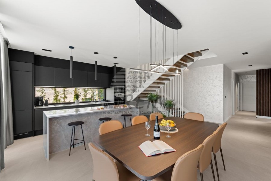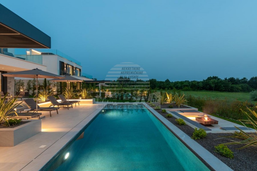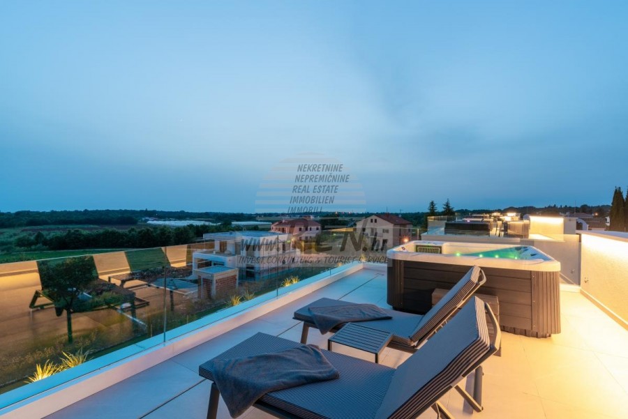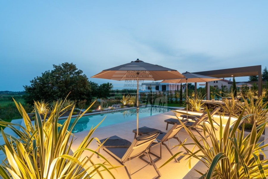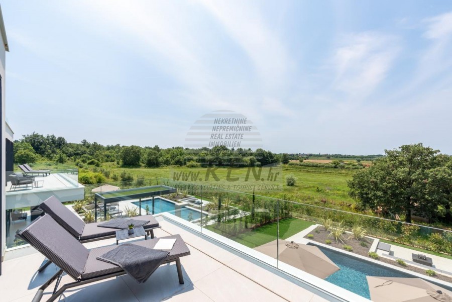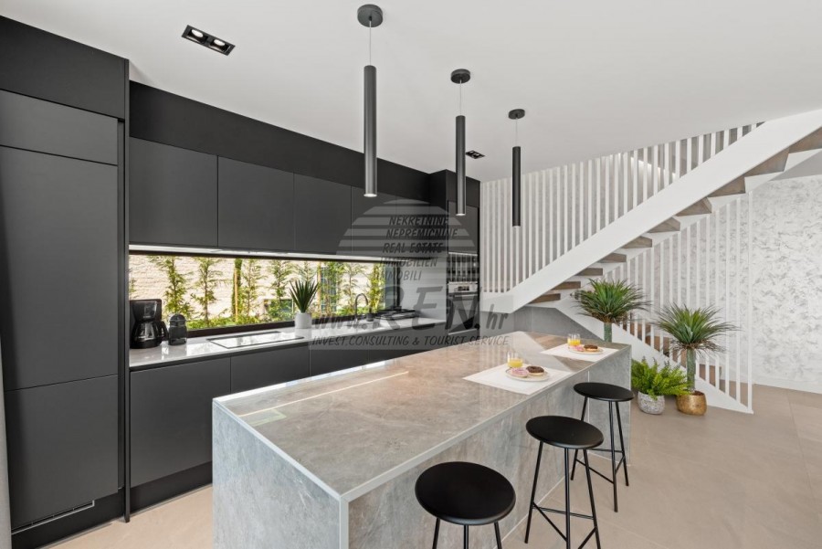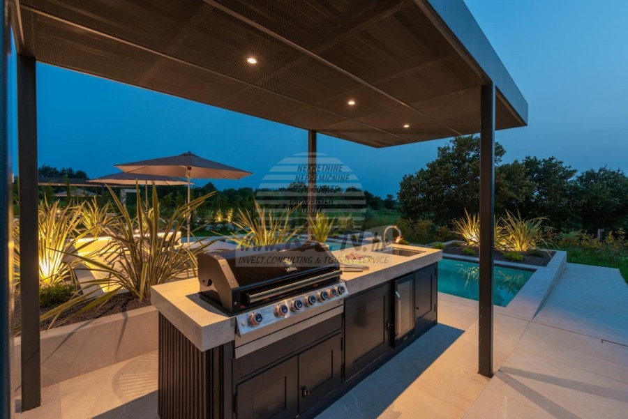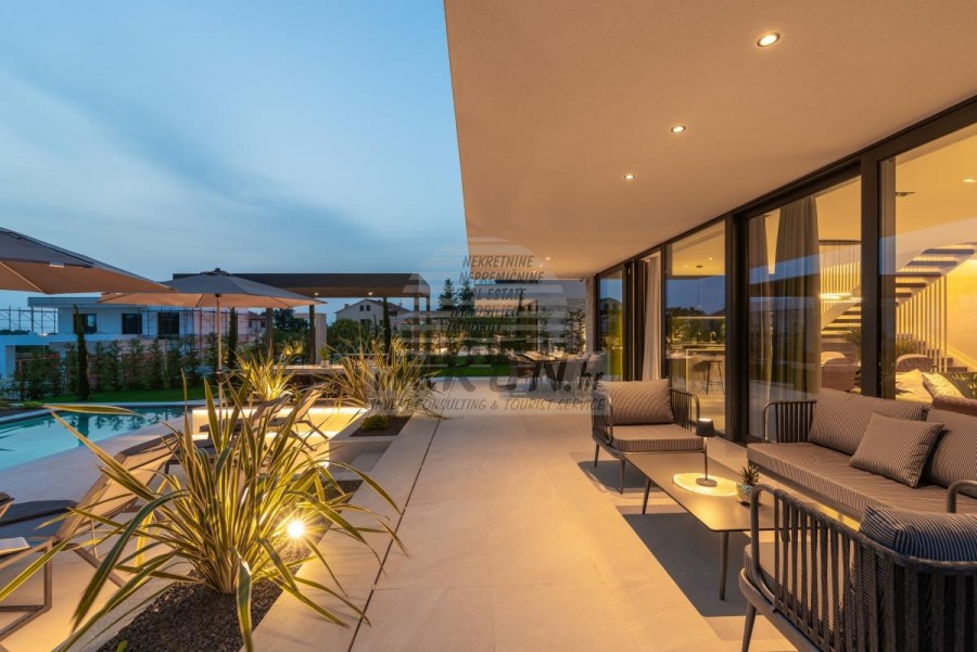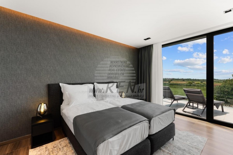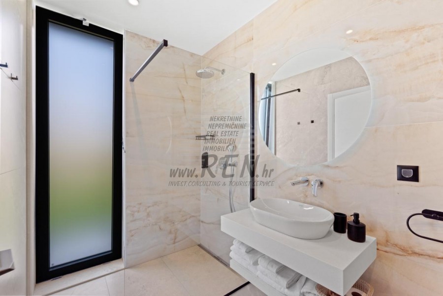 Il complesso di ville si trova su una superficie di 3730 m2. Si compone di 4 edifici indipendenti, completamente arredati e attrezzati con vista sul mare aperto. Metratura lorda di ciascuna abitazione: 270 mq (contano solo le superfici chiuse) Superficie residenziale netta interna: 204 mq (parte chiusa) Netti, aperti coperti e scoperti: 310 mq (lettino prendisole, tettoia, balconi, vialetti, braciere, terrazza sul tetto, scala esterna) Parcheggio: 3 posti auto (40 m2), ogni casa. Piscina: 36 m2 di superficie d'acqua Villa Parenzo uno - terreno 984 m2 - area verde 440 m2 Classe energetica: A (20 kWh/m2 anno) Pianta: P+1, (piano terra + primo piano) Il piano terra è composto da un ingresso, una scala per l'accesso al primo piano e alla terrazza sul tetto, un soggiorno, una cucina e una sala da pranzo, una camera da letto con bagno separato, un ulteriore WC, un bagno e una sauna, un locale tecnico con lavanderia, ripostiglio e wc esterno, ciascuno con ingresso indipendente. Al primo piano troviamo una scala, un corridoio, tre camere da letto con bagni separati e una palestra. C'è anche l'accesso alla terrazza sul tetto, dove si trovano un bar all'aperto, una zona solarium e una vasca idromassaggio. L'ambiente comprende una piscina esterna riscaldata, una zona prendisole, una terrazza coperta per pranzare, una tettoia con cucina estiva e una terrazza scoperta direttamente accanto alla piscina. C'è un pozzo del fuoco nella parte inferiore del cortile. Nel cortile è presente anche una doccia esterna di design con acqua calda e sifone a pavimento. La potenza elettrica noleggiata è di 18,86 kw - trifase, per ciascuna abitazione. Carpenteria esterna: Fabbro in alluminio di grande formato. Profilo in alluminio - ALIPLAST. Vetro SUNGUARD SN 70/35 HT 6 mm Temperato (70% Trasmissione Della Luce 35% Fattore Solare 1,0 W/m²K valore U) + 16 mm Al nero, PU, Argon + FLOAT CLEAR, 6 mm indurito. Profili con ponte termico interrotto, plastificati (RAL 7016). Tutte le porte, finestre e posizioni fisse sono realizzate con il sistema ALIPLAST SUPERIAL 800 e SUPERIAL (profondità telaio 75mm, profondità anta 75mm). Le posizioni di scorrimento sono realizzate nel sistema ULTRAGLIDE (profondità telaio 154 mm). Il coefficiente di trasferimento del calore per tutte le posizioni è inferiore a 1,3 W/(m2*K). Isolamento delle pareti: combinazione al piano terra di styrodur XPS 8 cm + rivestimento in pietra 5 cm e polistirolo EPS 10 cm, dove non è presente pietra. Pavimenti in polistirolo EPS 16 cm - facciata bianca e polistirolo 10 cm sulle parti antracite. Pietra di Canfanaro tagliata a mano, spessore 5 cm. Riscaldamento: Vailant, pompa di calore aria-acqua esterna alimentata da energia elettrica - impianto di riscaldamento da 10,3 kw e preparazione acqua calda in classe energetica A++, con un ulteriore locale macchine in casa e un boiler da 300 litri e circolazione. Riscaldamento a pavimento in tutte le stanze con regolatori separati per camera/bagno. Possibile controllo remoto tramite rete Wi-Fi. Raffreddamento/riscaldamento: È stato installato un sistema Samsung Multi Split con due unità esterne e 6 unità interne. Dotato della capacità di raffreddare e riscaldare lo spazio fino a -30°C di temperatura esterna. Inoltre, i dispositivi sono dotati della tecnologia Wind-freeTM per un piacevole flusso d'aria. Possibile controllo remoto tramite rete Wi-Fi. Attrezzatura: • Impianti sanitari Premium Duravit, rubinetteria Grohe, sistemi di drenaggio Geberit e Tece, cassette Grohe, cabina doccia. • Ceramiche di altissima qualità delle più famose aziende italiane (Graniti Fiandre, Panaria, Keope, Love). Nei bagni, ceramiche di grande formato, posizionate fino al soffitto. • Sistema integrato per l'addolcimento dell'acqua proveniente dalla rete idrica. • Sistema di allarme Ajax di fascia alta integrato con sensore di movimento, rilevatore di perdite d'acqua e rilevatore di incendio. Versione in nero. • Videosorveglianza DVC con registratore HDD da 2 TB e 4 telecamere IP esterne da 5 Mpx. • Illuminazione del produttore austriaco Eglo. • Interruttori interni, pulsanti e prese del marchio italiano Bticino del gruppo Legrand. • Antenna e sistema satellitare completi integrati per ogni stanza. • Amplificatori di segnale Wi-Fi aggiuntivi integrati in casa e sulla terrazza esterna. • Porte interne del noto produttore italiano Braga con cerniere a scomparsa e serrature magnetiche, larghezza 44 mm, design Bianco Matrix con maniglie Prisma nere. • Videocitofono con controllo dell'apertura della porta d'ingresso e controllo elettronico. il cancello. • Caricatore Wallbox per la ricarica di auto elettriche Mercedes-Benz fino a 22 kW • Biocamino nel soggiorno • Canali e scarichi esterni su terrazze e balconi del principale produttore tedesco Aco • Ringhiera in vetro sul balcone e sulla terrazza sul tetto Cucina e mobili • Cucina Dan Kuchen, modello Silbermond nella versione antracite - cucina e isola, con piano in ceramica Sapienstone - Fior di Bosco, spessore 12 mm. • La cucina è dotata di tutti gli elettrodomestici da incasso Bosch necessari (forno, microonde, piano cottura, lavastoviglie e frigorifero combinato). • Nell'isola è installato anche un frigorifero per vino della marca Candy. • Lavello Franke, rubinetto Grohe, cappa Faber con canale di ventilazione. • Lavatrice e Asciugatrice Bosch, Serie 6, entrambe con capacità maggiore di 9 kg, situate in un armadio appositamente progettato nel locale tecnico. • Smart TV in tutte le camere, la dimensione nel soggiorno è di 75'' QLED 4K, mentre tutte le altre camere hanno una TV di dimensioni 55'' UHD LED 4K. • Le camere sono dotate di letti matrimoniali con materassi premium della linea Hespo Luxury Plus, armadi a muro, scrivania con poltrona Kave Home e lampade da notte. • In tutte le stanze sono stati installati tappeti Piere Cardin e parte delle pareti sono state rivestite con doghe Lamelio Milo color noce e carte da parati