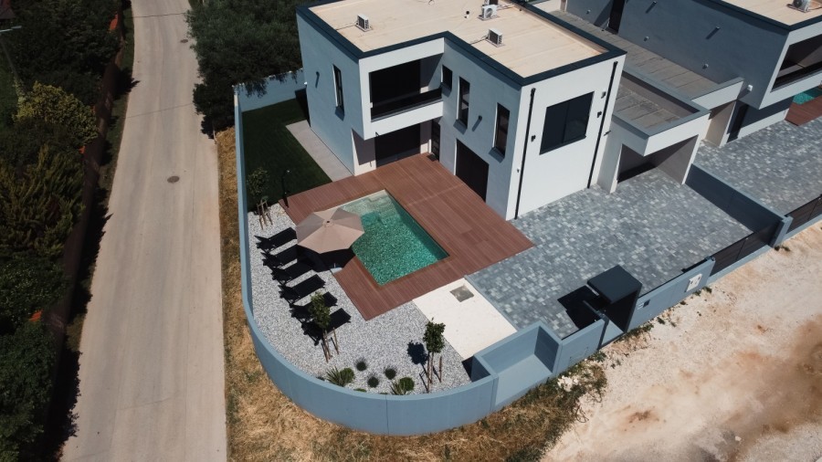 Pomer, bella casa bifamiliare con piscina e vista mare. Posizione top a Pomer.+ La casa si trova a Pomer, vicino alla marina ACI e al centro del paese. La casa ha un design moderno, una costruzione di qualità, attrezzature di alta qualità: il piano terra è composto da un corridoio, un soggiorno con cucina e sala da pranzo, un WC, 1 camera da letto con bagno, un ripostiglio e un terrazzo che si apre sulla piscina (350x580x150) con tecnologia automatica Al piano terra c'è anche un garage e una taverna invernale che ha molteplici possibilità di trasformazione, anche climatizzata Al primo piano ci sono altre 2 camere, ciascuna con bagno e terrazza, e sono dotate di aria condizionata. La casa è completamente attrezzata con riscaldamento centralizzato/a pavimento, videosorveglianza + sistema di allarme. Il cortile è composto da parcheggio per 2 auto, piscina e giardino con irrigazione ambientale automatica Ideale sia per il turismo che per l'abitazione familiare. Si propone una villetta bifamiliare, alle stesse condizioni.