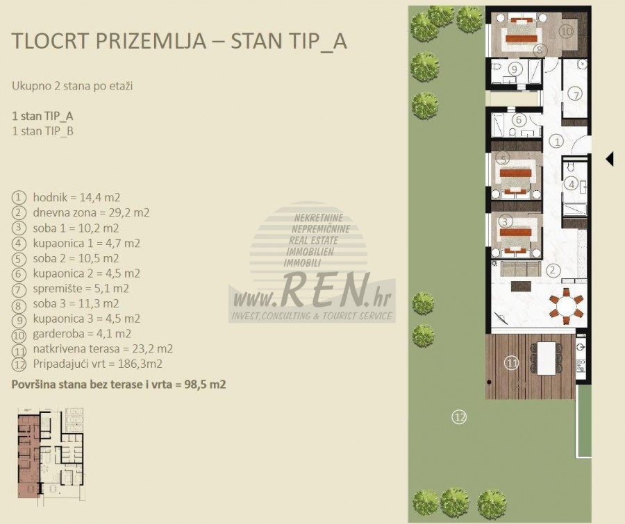 Immobili di lusso Istria, vendo appartamento esclusivo, Novigrad-Cittanova Appartamento 1B a Cittanova ha un totale di 98,5 m2 senza terrazza + 186 m2 di giardino, si trova al piano terra, fase di costruzione, 5 min. (1000m) dal mare e dalla bellissima spiaggia, a 5 min. (1000 m) dal centro di Cittanova. L'appartamento è composto da cucina/soggiorno/sala da pranzo, 3 camere da letto, 3 bagni, ripostiglio, guardaroba, terrazzo 23,20 m2. Specifiche dell'appartamento: • Edificio ad efficienza energetica A o A+ • Ceramiche di classe I di maggiori dimensioni • Parquet in classe I di dimensioni maggiori • Porte antifurto e tagliafuoco • Sanitari Hansgrohe e Catalano • Videocitofono • Sistema di videosorveglianza all'ingresso • Smaltimento rifiuti recintato • Cancello pedonale d'ingresso • Cancello carrabile d'ingresso • Deposito per ogni appartamento • Spazio per le biciclette • Parcheggio interno • Posti auto coperti o garage • Riscaldamento a pavimento • Predisposizione per pannelli solari sul tetto • Predisposizione per caricabatterie per auto elettriche • Set di illuminazione esterna di appartamenti ed edifici • Ampio ingresso • Ascensore • Carpenteria in PVC/ALU • Rivestimenti in decking sui terrazzi • Copertura del soffitto del terrazzo • Predisposizione per la cucina sul terrazzo • Collegamento al caminetto • Scarico per ogni cappa con uscita sulla facciata o sul tetto • Irrigazione automatica dei green condivisi superficie • Irrigazione automatica delle aree verdi degli appartamenti in piano terra Riscaldamento e tramite sistema multisplit DAIKIN di unità interne ed esterne, pompe di circolazione per l'acqua calda in tutto l'appartamento, termostati individuali e controllo della temperatura per ogni stanza, controllo remoto dell'impianto di riscaldamento e raffrescamento tramite smartphone, unità esterne posizionate sul tetto dell'edificio, appartamenti al piano terra su superficie verde. Impianto videocitofonico a colori, cavo ottico consegnato in ogni appartamento. La garanzia sulla struttura è di 10 anni, per lavori edili e artigianali di 2 anni e per attrezzature e apparecchiature secondo i termini di garanzia del produttore. Per ulteriori informazioni stiamo alla vostra disposizione.