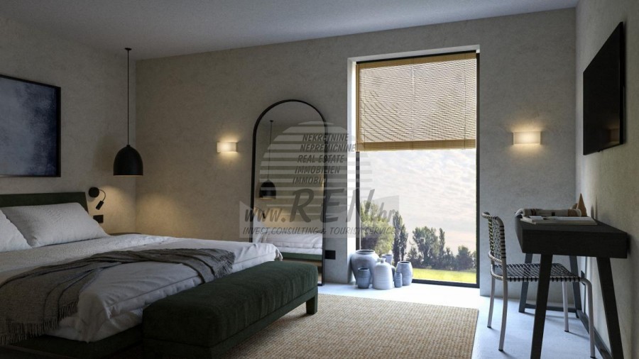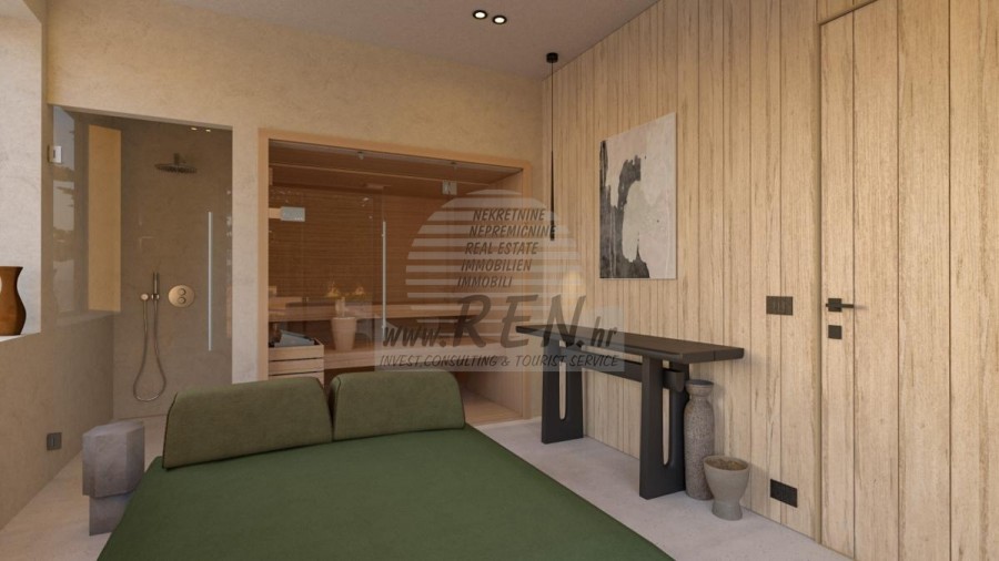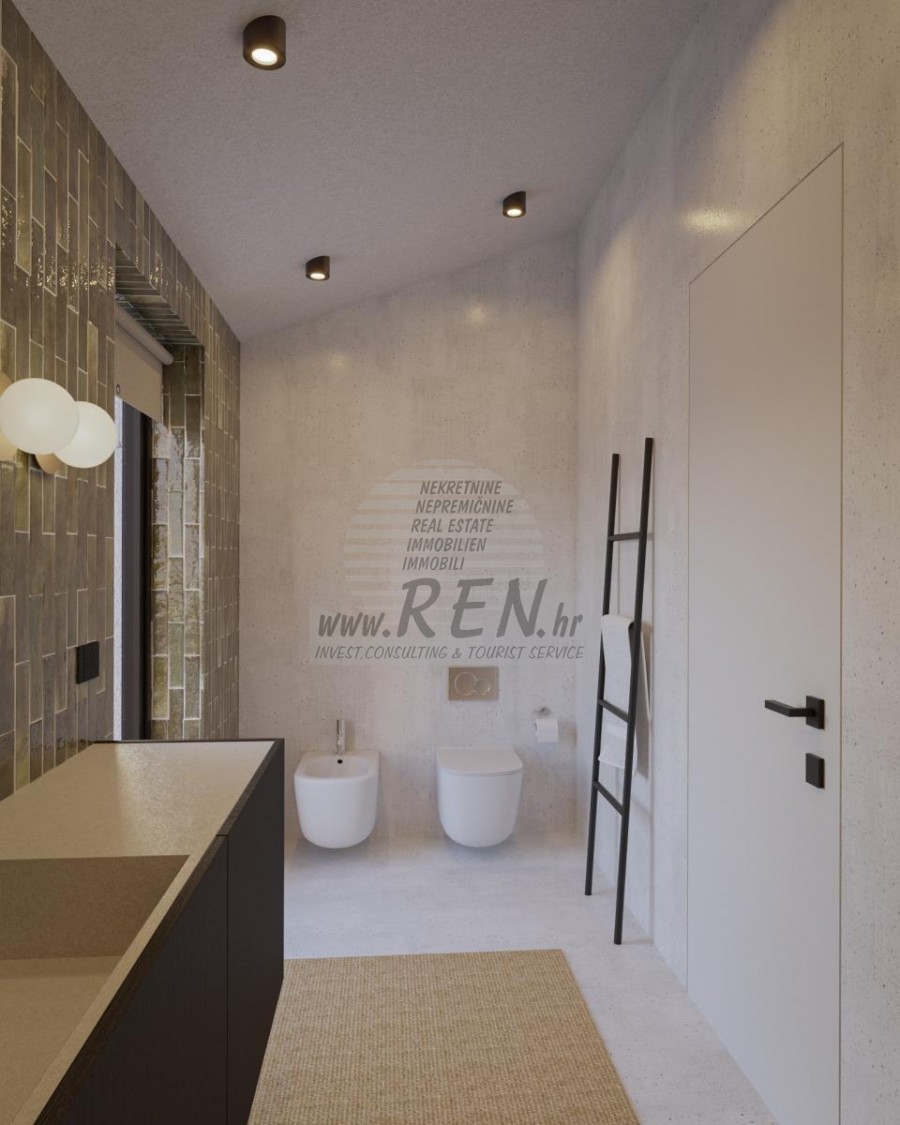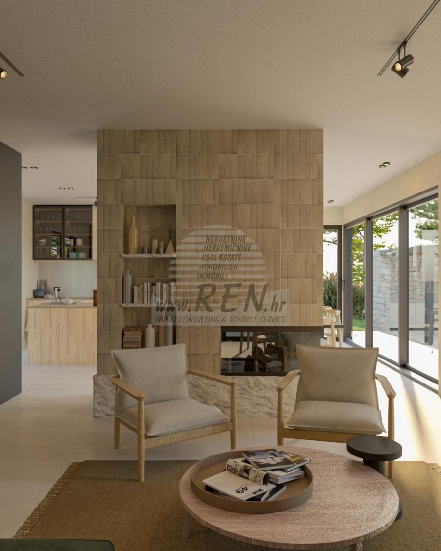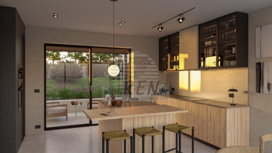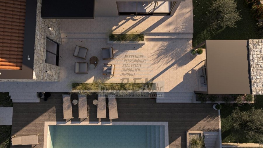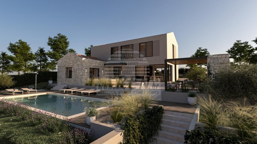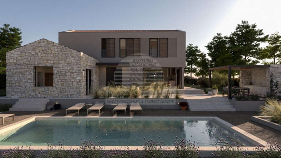 Immobili Istria, vendo casa moderna, Poreč-Parenzo Situata a 15 km dal centro di Parenzo e a 10 km dal mare più vicino di Orsera e dalle sue spiagge, su una collina, è in costruzione una villa con 180 m2 di superficie abitabile interna su un totale di 938 m2 di terreno. Il terreno ha una bella forma regolare e come tale consente il massimo utilizzo per ulteriori strutture nel giardino. La casa è composta da due piani: il piano terra, dove si trovano spazi abitativi in un concetto aperto, servizi igienici, guardaroba e locali tecnici per il sistema di riscaldamento centralizzato e lavanderia con tutti i collegamenti necessari, nonché locali per riporre oggetti personali, biciclette e attrezzature mobili per il giardino e la piscina. La parte speciale del piano terra incanta con un'irrinunciabile area benessere con sauna e doccia. Ci sono 3 camere da letto con bagni separati al primo piano. In un comodo giardino recintato, ricco di ulivi secolari, fiori autoctoni e prato con irrigazione, si trova la piscina riscaldata di 40 mq con solarium e camino con zona pranzo coperta dove si trova la cucina estiva. si trova. Naturalmente da sottolineare l'imponente cancello metallico che incornicia l'intero quadro all'interno della proprietà murata. Parcheggio per due veicoli con caricatore per veicoli elettrici. Costruzione di altissima qualità con isolamento facciata da 10 e 15 cm, finestre in PVC, persiane scorrevoli in alluminio nelle camere, pareti vetrate correvoli al piano terra, riscaldamento a pavimento ad acqua con pompa di calore Mitsubishi, impianto di raffrescamento, porte filomuro, rivestimento del pavimento in microtopping, obili e illuminazione italiani e attrezzature di fascia alta sia negli interni che negli esterni sono le caratteristiche principali che guidano l'investitore nella costruzione dell'intero racconto. Tutto quanto sopra evoca l'immagine di una splendida villa che soddisfa tutti i parametri anche dei più esigenti. Per ulteriori informazioni, si prega di contattarci.