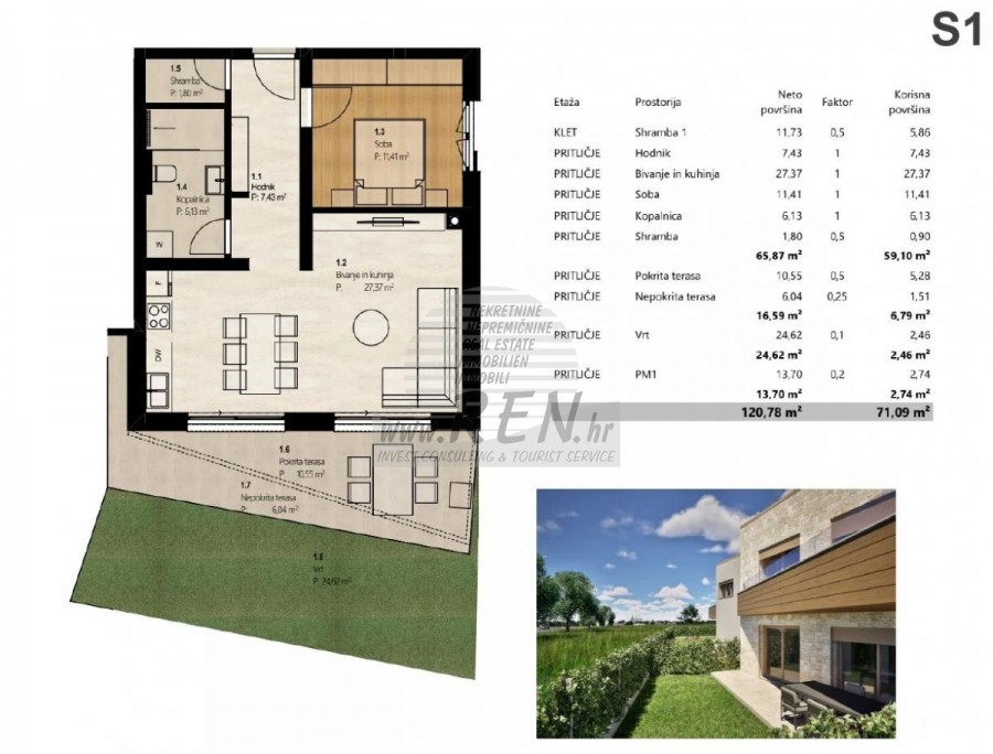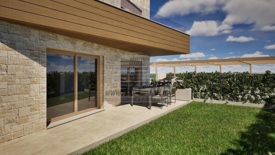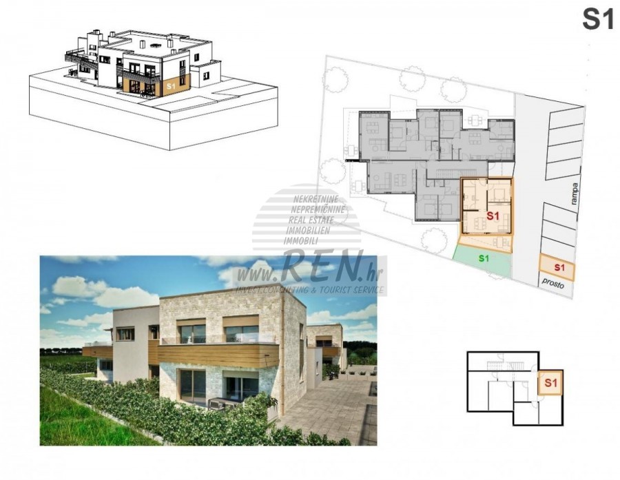 L'edificio è destinato esclusivamente a uso residenziale, senza spazi commerciali e comuni, ed è concepito come un'unità architettonica indipendente dal design moderno e dalla funzionalità spaziale. Struttura dell'edificio L'edificio è composto da piano terra, primo piano e seminterrato. Un totale di sei appartamenti sono disposti in unità verticali, con giardini e terrazze indipendenti. 2. ORGANIZZAZIONE DELLE UNITÀ RESIDENZIALI - Appartamenti S1–S4 (piano terra): Hanno accesso diretto ai propri giardini e terrazze esterne. - Appartamenti S5 e S6 (primo piano): Sono dotati di ampie terrazze scoperte, con spazio sufficiente per vivere e pranzare all'aperto. - Ogni appartamento dispone di un ripostiglio seminterrato separato e di un posto auto. Accesso L'intero complesso è recintato e protetto da una rampa di sollevamento automatica telecomandata, che consente un accesso senza ostacoli e sicuro a persone con difficoltà motorie, passeggini e biciclette. 3. COSTRUZIONE E ATTREZZATURE Costruzione La struttura portante è costituita da uno scheletro in cemento armato con solette interpiano in cemento armato e pareti in muratura. L'edificio è progettato con un'elevata resistenza statica e sismica. Facciata e tetto Facciata a contatto con isolamento di 10 cm di spessore. La finitura combina i toni chiari dell'intonaco con dettagli in pietra e rivestimenti decorativi in legno. Il tetto è piano. Classe energetica dell'edificio A+. Finestre e porte scorrevoli Finestre e porte scorrevoli in alluminio del marchio Cortizo con vetro isolante a triplo strato. Tapparelle elettriche del marchio MEDLE. Zanzariere con profili in alluminio. Porte - Porta d'ingresso Master EX3 – antieffrazione, tagliafuoco e insonorizzata. - Porta interna GD DORIGO (Italia) – in legno, con telaio piatto e cerniere a scomparsa, a filo muro, di elevata qualità. Pavimenti - Camere da letto: parquet multistrato in rovere ADMONTER (Austria); - Soggiorno e cucina: ceramiche di grande formato Atlas Concorde (Italia); - Bagni e logge: piastrelle in ceramica Atlas Concorde (Italia). Impianti sanitari Apparecchiature del rinomato marchio Villeroy and Boch: WC, bidet, lavabi, cabina doccia con canaletta e parete divisoria in vetro. Canna fumaria È prevista la predisposizione per l'allacciamento di una canna fumaria, per la possibilità di installare un camino interno. 4. ENERGIA ED ELETTRODOMESTICI Riscaldamento e acqua calda Impianto basato su una pompa di calore aria-acqua Mitsubishi, con distribuzione del calore tramite riscaldamento a pavimento in tutto l'appartamento. Raffrescamento Sistema multisplit Mitsubishi: consente la climatizzazione di tutti gli ambienti principali con un controllo della temperatura silenzioso ed efficiente. Ventilazione I bagni sono dotati di ventilazione meccanica controllata tramite ventilatori a soffitto. Impianti elettrici È presente un'ampia dotazione di apparecchiature elettriche con prese e interruttori sufficienti. Videocitofoni Il sistema videocitofonico consente l'accesso controllato e un ulteriore livello di privacy. Contabilizzazione dei consumi Ogni appartamento dispone di contatori individuali di acqua ed elettricità, inclusi gli allacciamenti per il deposito in cantina. Telecomunicazioni Sono disponibili connessioni Internet e TV. 5. ALLACCIAMENTI E INFRASTRUTTURE L'edificio è allacciato a: - rete idrica comunale; - rete fognaria; - rete elettrica; - illuminazione pubblica.