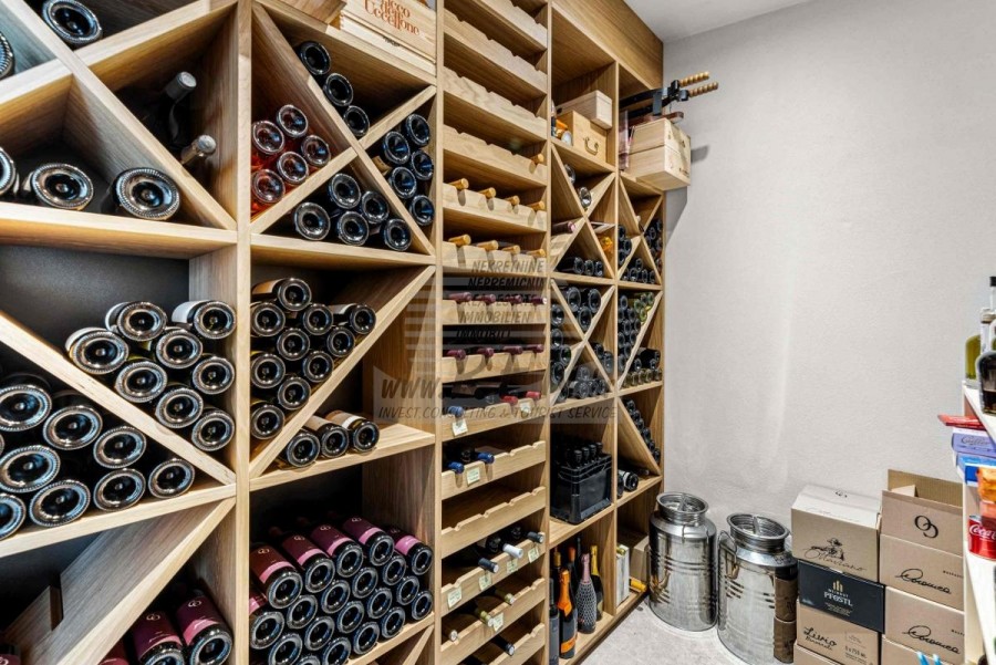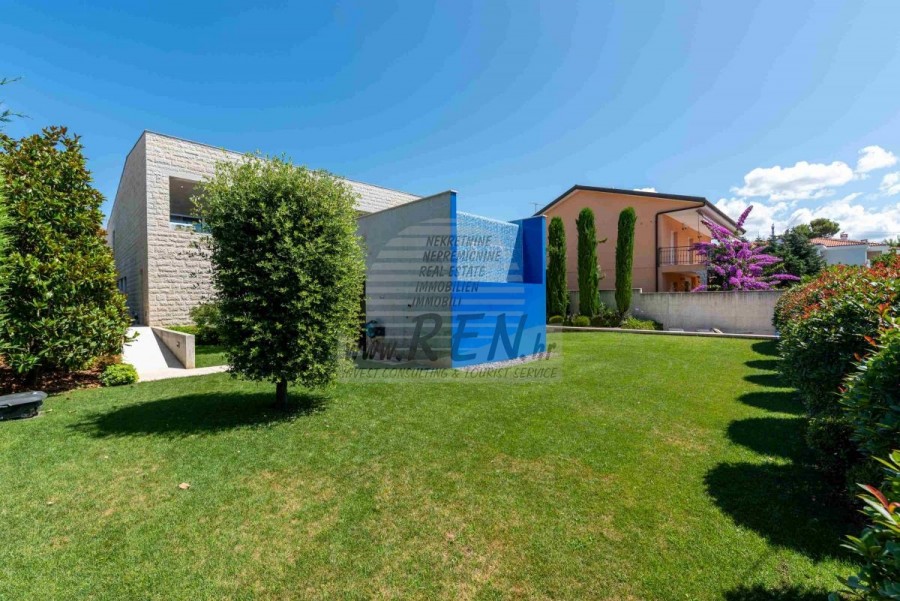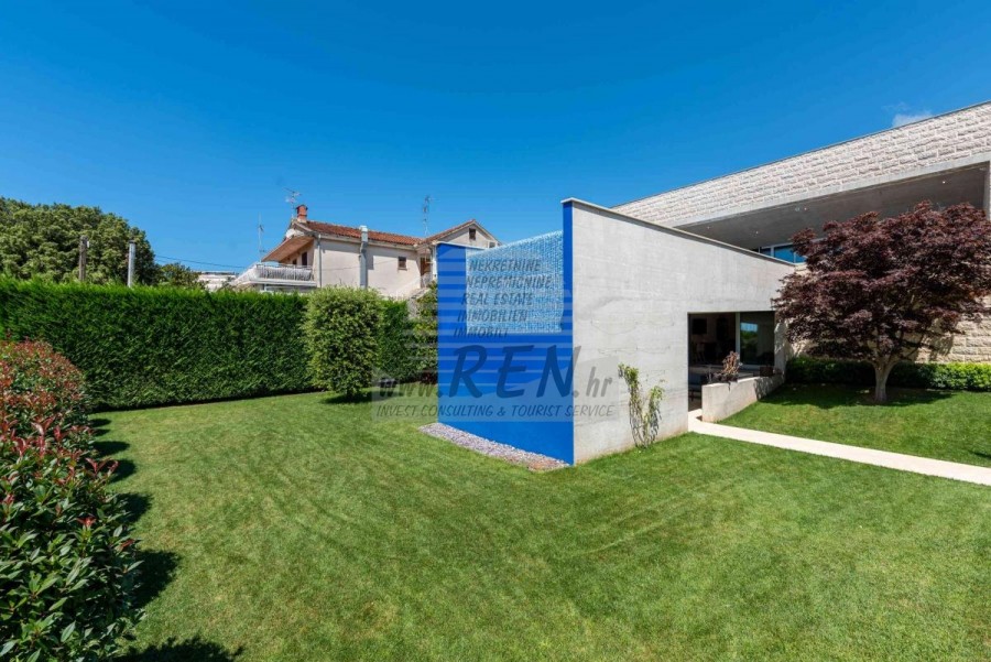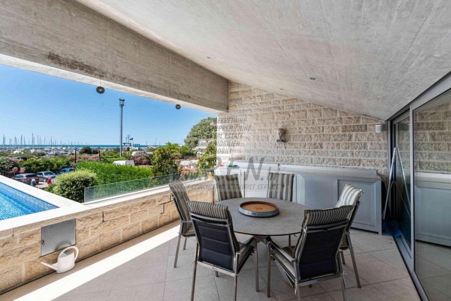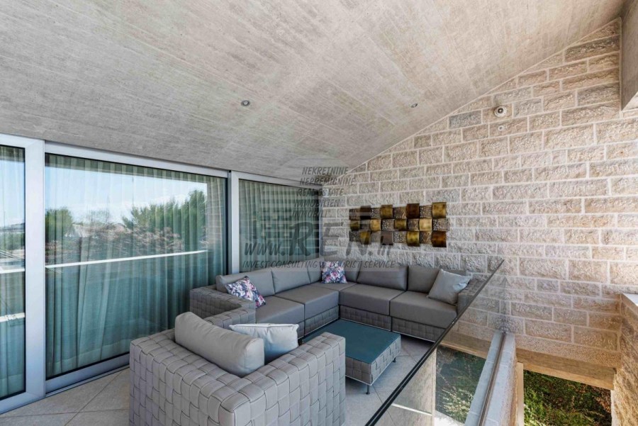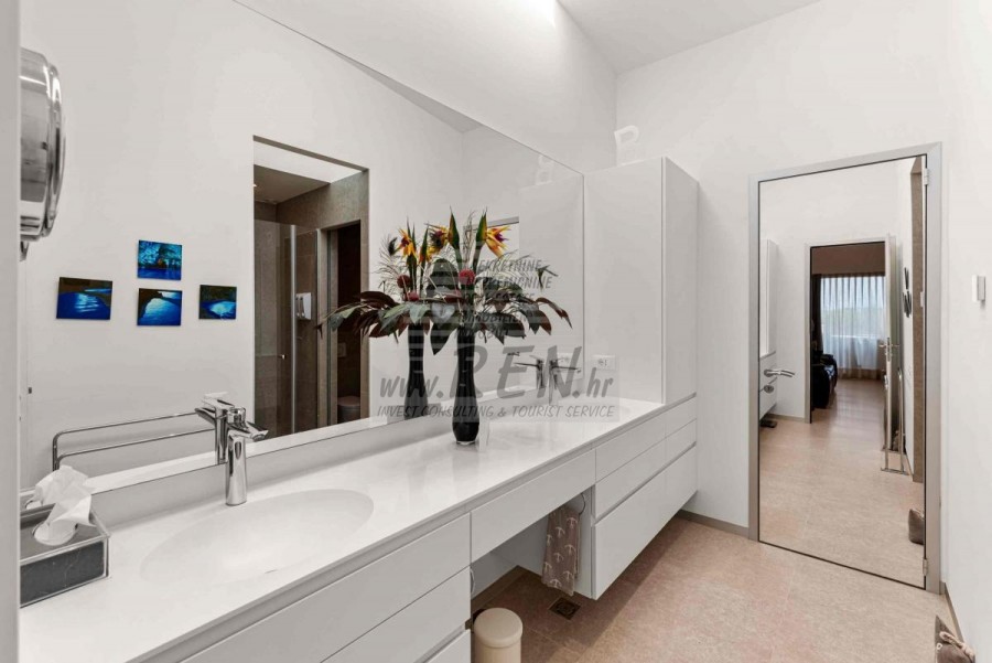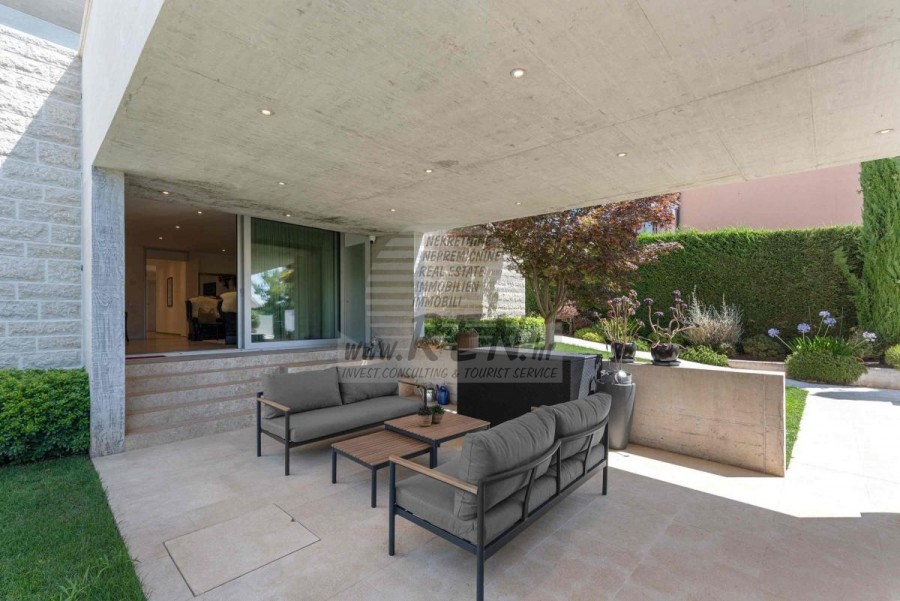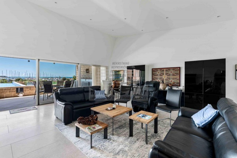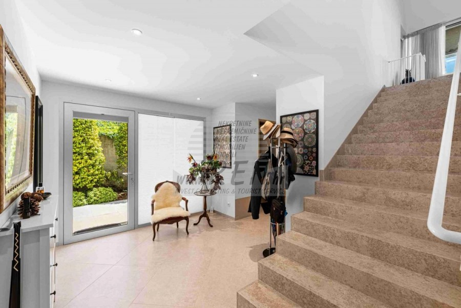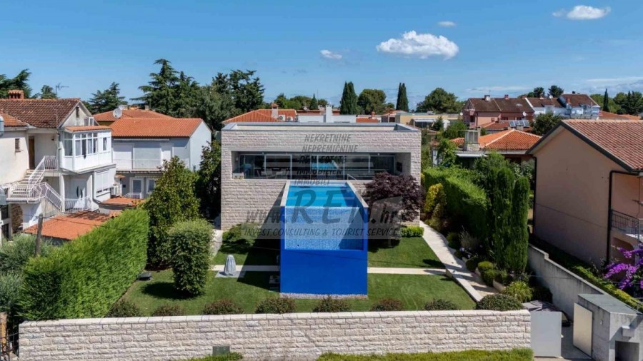 Lussuosa Villa Moderna presso l’ACI Marina – Residenza Esclusiva con Vista Mare Nel pieno centro di Umago, accanto all’ACI Marina e praticamente in prima fila sul mare, si trova questa straordinaria villa moderna in pietra che unisce design di alto livello, lusso ed un’architettura unica. Pur non trovandosi direttamente su una spiaggia balneabile, la villa offre uno stile di vita esclusivo nella zona più prestigiosa della città, con una vista mare incantevole e totale privacy. La villa dispone di 429 m² di superficie abitabile su un terreno curato di 956 m² ed è caratterizzata da una piscina unica di 50 m² accessibile direttamente dal primo piano, elemento architettonico distintivo. Al piano terra si trovano due camere da letto di lusso, ognuna con il proprio bagno, un garage per tre auto, lavanderia, sauna, soggiorno e una piccola cucina. Il primo piano offre una grande terrazza con accesso diretto alla piscina, la master bedroom con cabina armadio e bagno privato, un ufficio, un elegante soggiorno e un’ampia cucina principale con dispensa e vinoteca. La villa è dotata di ascensore, riscaldamento a pavimento, riscaldamento a gas, climatizzazione e riscaldamento a soffitto, garantendo massimo comfort tutto l’anno. Una proprietà davvero esclusiva nel cuore di Umago, perfetta per chi cerca lusso autentico.