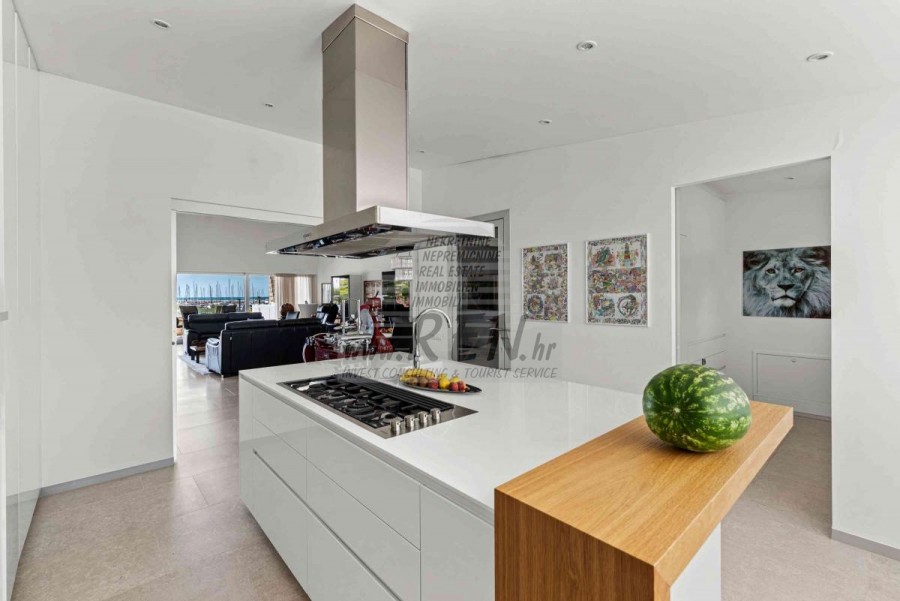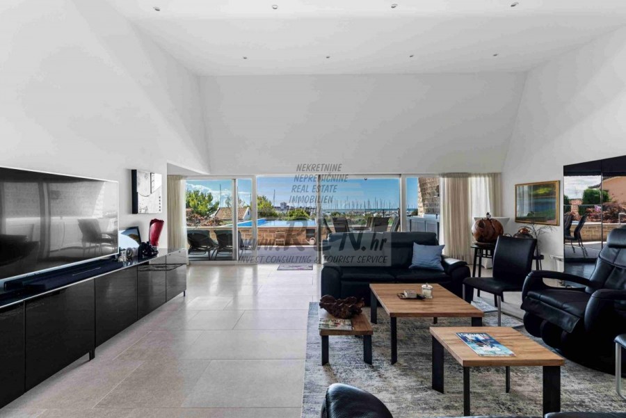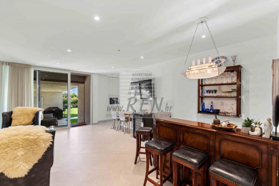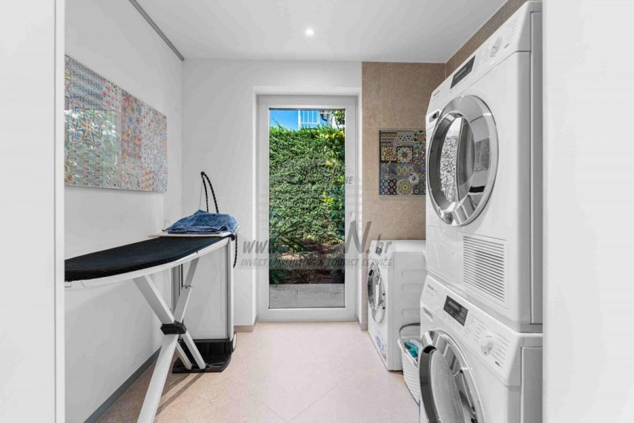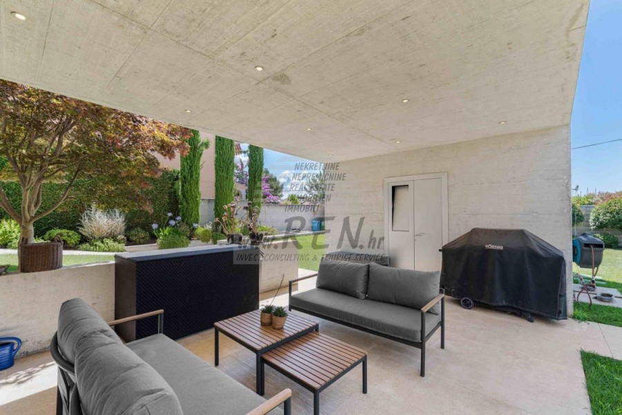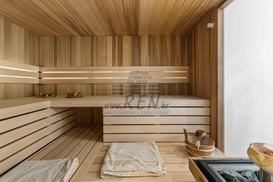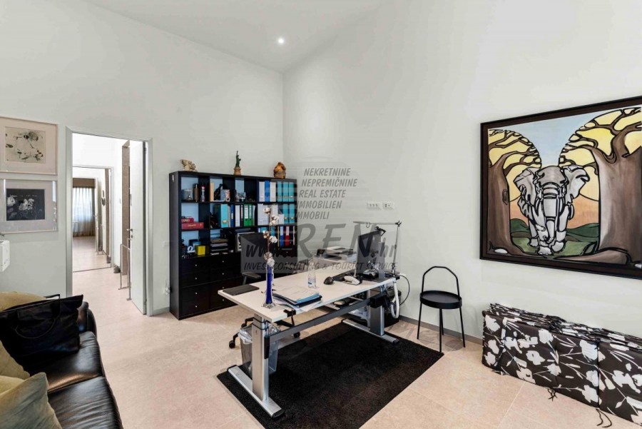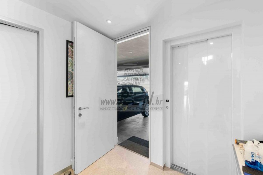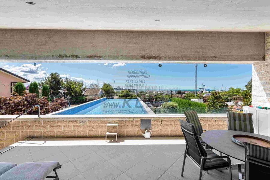 Lussuosa Villa Moderna presso l’ACI Marina – Residenza Esclusiva con Vista Mare Nel pieno centro di Umago, accanto all’ACI Marina e praticamente in prima fila sul mare, si trova questa straordinaria villa moderna in pietra che unisce design di alto livello, lusso ed un’architettura unica. Pur non trovandosi direttamente su una spiaggia balneabile, la villa offre uno stile di vita esclusivo nella zona più prestigiosa della città, con una vista mare incantevole e totale privacy. La villa dispone di 429 m² di superficie abitabile su un terreno curato di 956 m² ed è caratterizzata da una piscina unica di 50 m² accessibile direttamente dal primo piano, elemento architettonico distintivo. Al piano terra si trovano due camere da letto di lusso, ognuna con il proprio bagno, un garage per tre auto, lavanderia, sauna, soggiorno e una piccola cucina. Il primo piano offre una grande terrazza con accesso diretto alla piscina, la master bedroom con cabina armadio e bagno privato, un ufficio, un elegante soggiorno e un’ampia cucina principale con dispensa e vinoteca. La villa è dotata di ascensore, riscaldamento a pavimento, riscaldamento a gas, climatizzazione e riscaldamento a soffitto, garantendo massimo comfort tutto l’anno. Una proprietà davvero esclusiva nel cuore di Umago, perfetta per chi cerca lusso autentico.