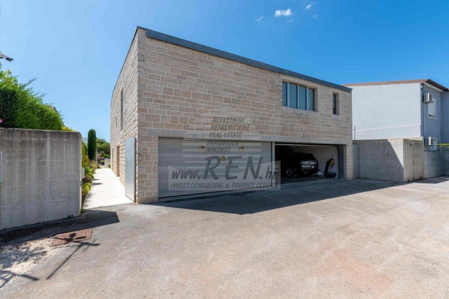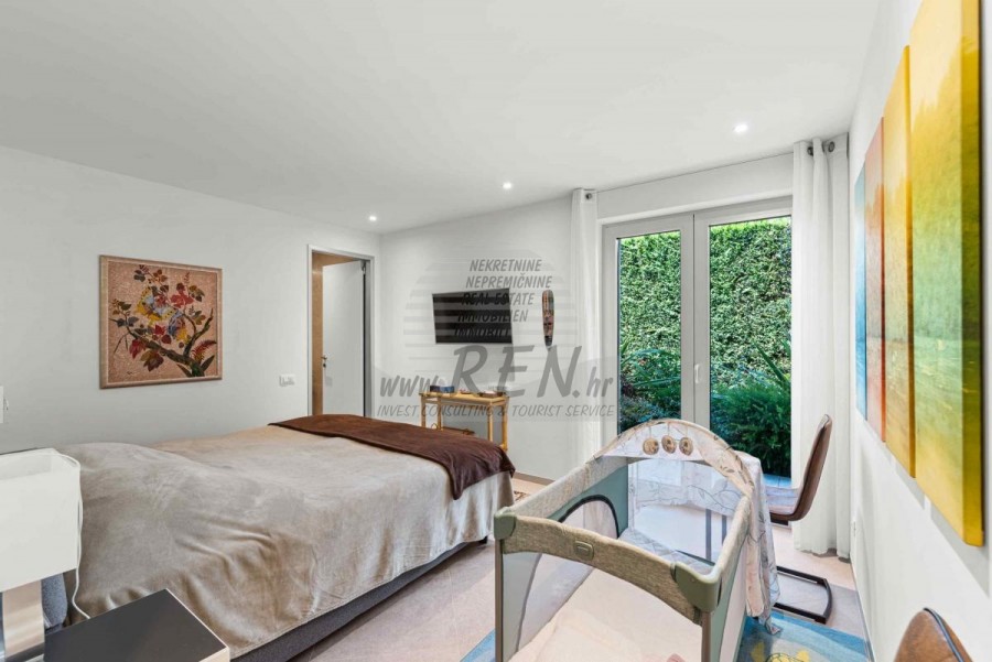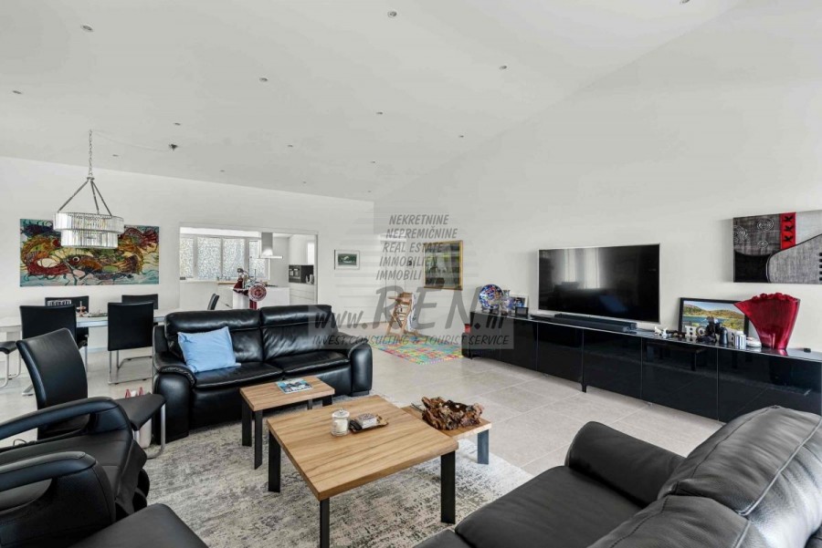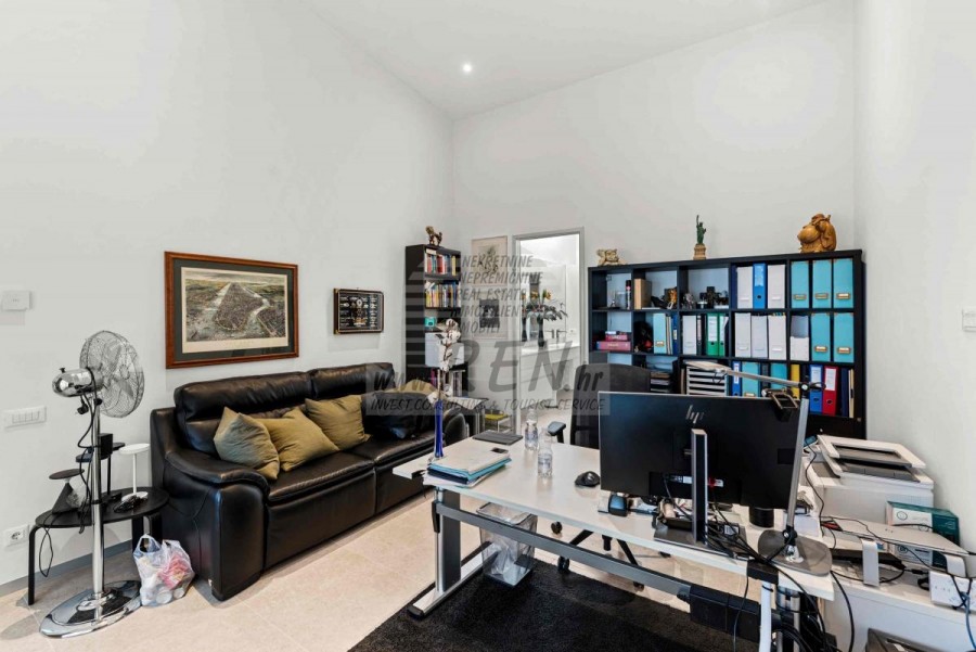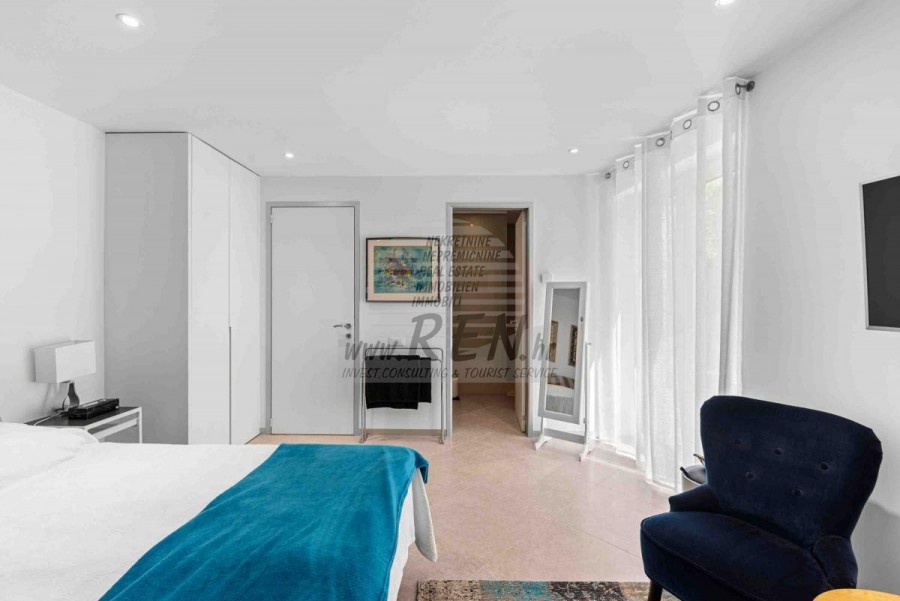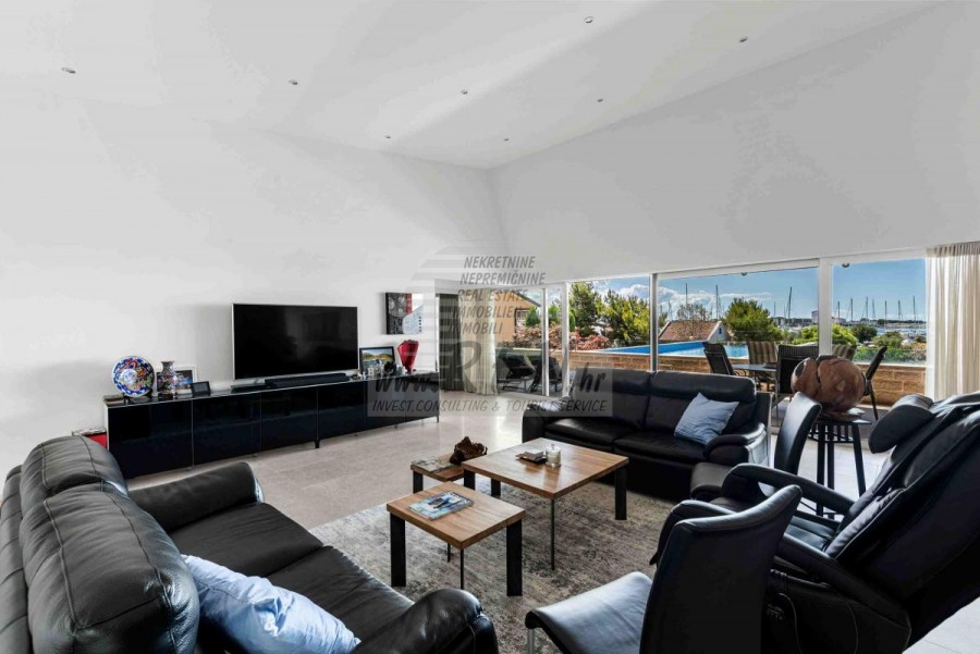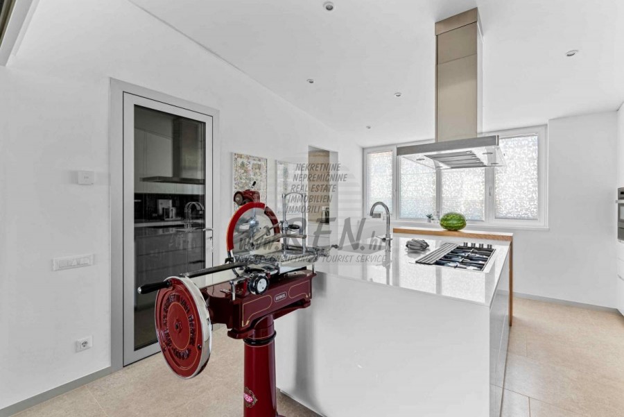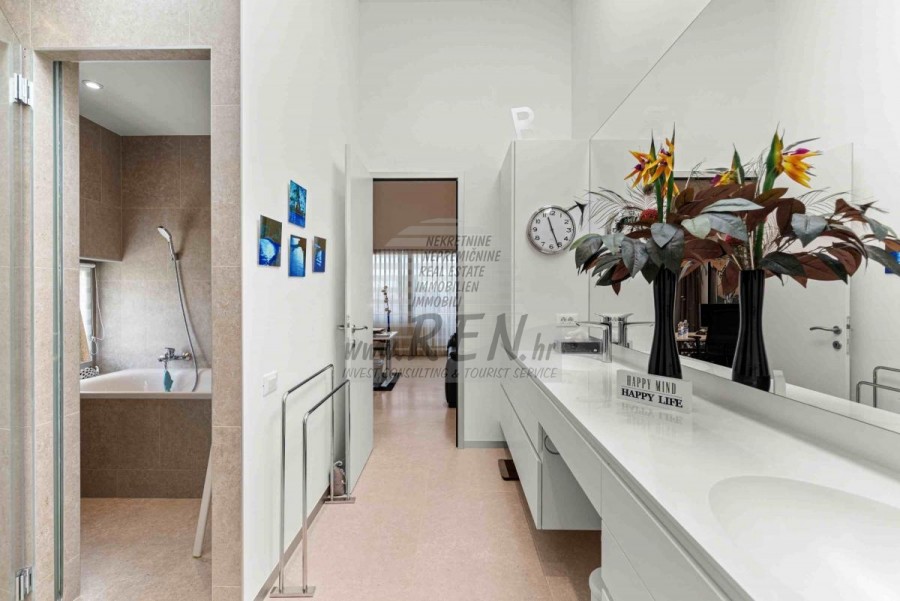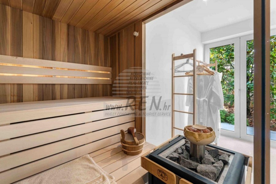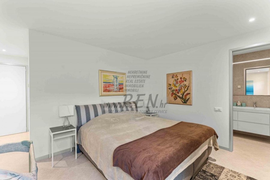 Lussuosa Villa Moderna presso l’ACI Marina – Residenza Esclusiva con Vista Mare Nel pieno centro di Umago, accanto all’ACI Marina e praticamente in prima fila sul mare, si trova questa straordinaria villa moderna in pietra che unisce design di alto livello, lusso ed un’architettura unica. Pur non trovandosi direttamente su una spiaggia balneabile, la villa offre uno stile di vita esclusivo nella zona più prestigiosa della città, con una vista mare incantevole e totale privacy. La villa dispone di 429 m² di superficie abitabile su un terreno curato di 956 m² ed è caratterizzata da una piscina unica di 50 m² accessibile direttamente dal primo piano, elemento architettonico distintivo. Al piano terra si trovano due camere da letto di lusso, ognuna con il proprio bagno, un garage per tre auto, lavanderia, sauna, soggiorno e una piccola cucina. Il primo piano offre una grande terrazza con accesso diretto alla piscina, la master bedroom con cabina armadio e bagno privato, un ufficio, un elegante soggiorno e un’ampia cucina principale con dispensa e vinoteca. La villa è dotata di ascensore, riscaldamento a pavimento, riscaldamento a gas, climatizzazione e riscaldamento a soffitto, garantendo massimo comfort tutto l’anno. Una proprietà davvero esclusiva nel cuore di Umago, perfetta per chi cerca lusso autentico.