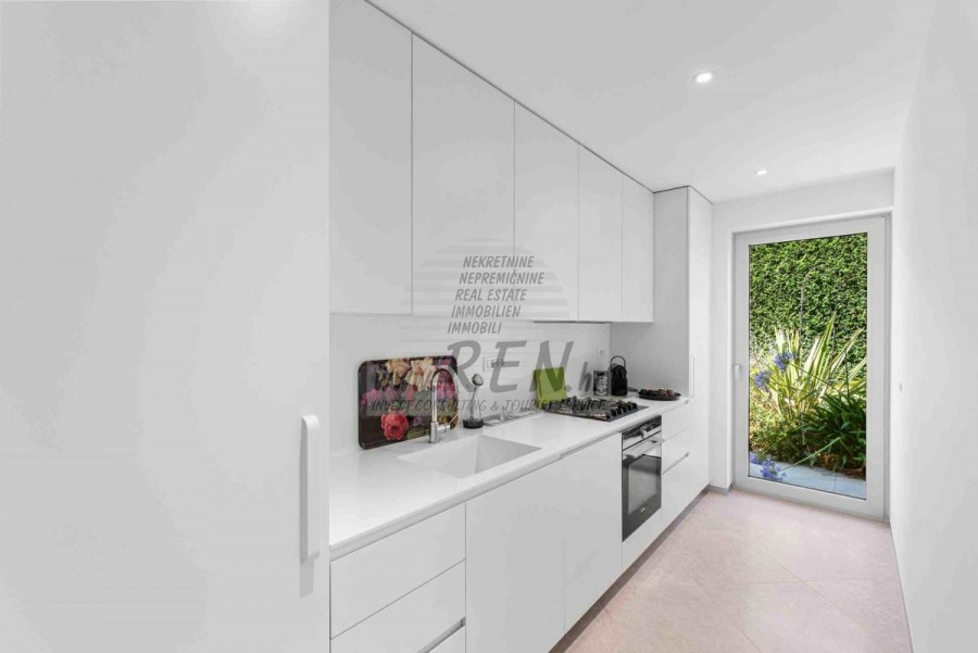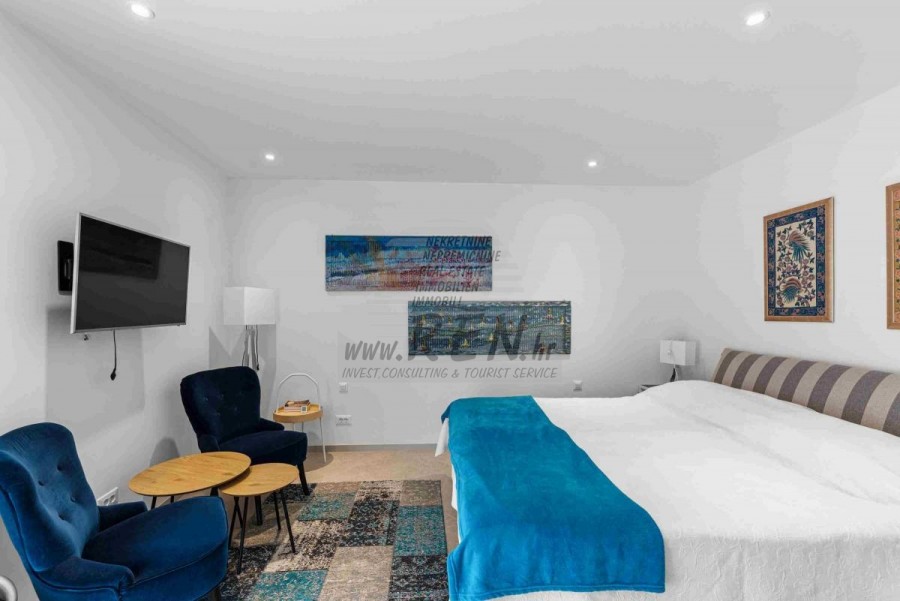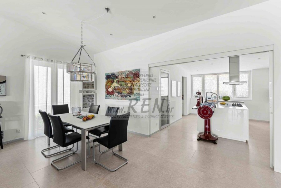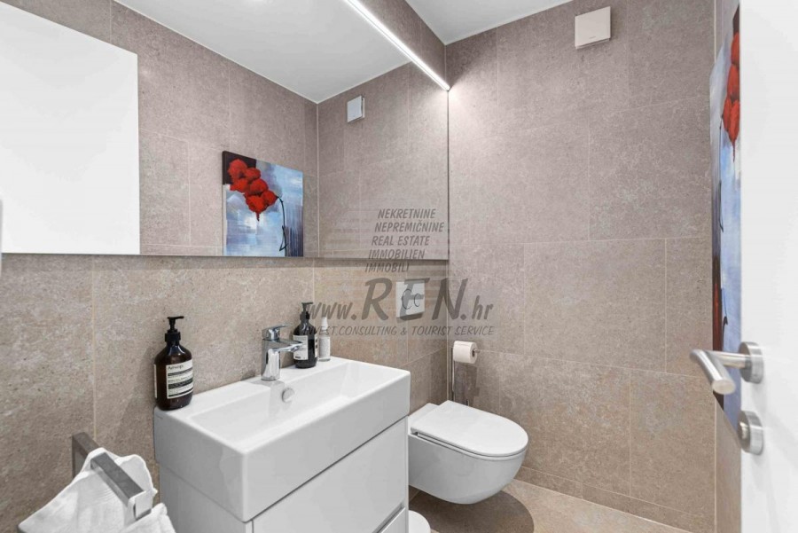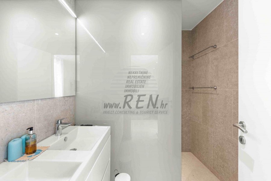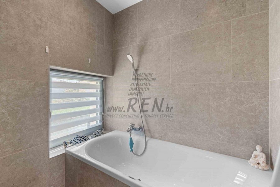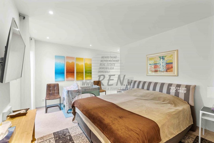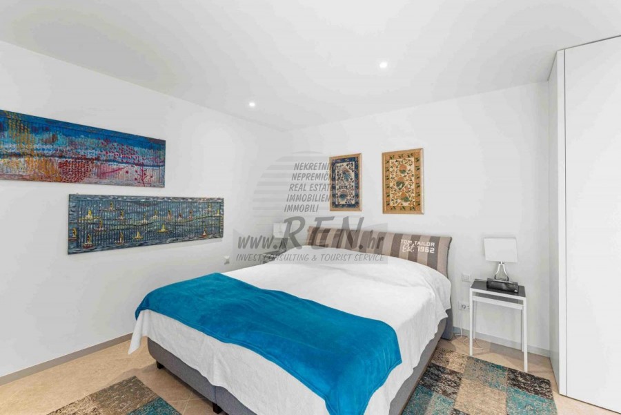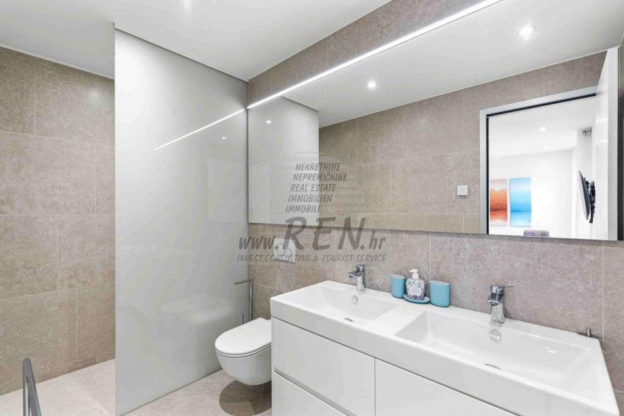Lussuosa Villa Moderna presso l’ACI Marina – Residenza Esclusiva con Vista Mare Nel pieno centro di Umago, accanto all’ACI Marina e praticamente in prima fila sul mare, si trova questa straordinaria villa moderna in pietra che unisce design di alto livello, lusso ed un’architettura unica. Pur non trovandosi direttamente su una spiaggia balneabile, la villa offre uno stile di vita esclusivo nella zona più prestigiosa della città, con una vista mare incantevole e totale privacy. La villa dispone di 429 m² di superficie abitabile su un terreno curato di 956 m² ed è caratterizzata da una piscina unica di 50 m² accessibile direttamente dal primo piano, elemento architettonico distintivo. Al piano terra si trovano due camere da letto di lusso, ognuna con il proprio bagno, un garage per tre auto, lavanderia, sauna, soggiorno e una piccola cucina. Il primo piano offre una grande terrazza con accesso diretto alla piscina, la master bedroom con cabina armadio e bagno privato, un ufficio, un elegante soggiorno e un’ampia cucina principale con dispensa e vinoteca. La villa è dotata di ascensore, riscaldamento a pavimento, riscaldamento a gas, climatizzazione e riscaldamento a soffitto, garantendo massimo comfort tutto l’anno. Una proprietà davvero esclusiva nel cuore di Umago, perfetta per chi cerca lusso autentico.