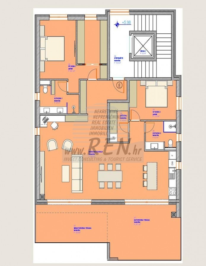 All’interno di un moderno complesso residenziale situato in una zona tranquilla e ricercata nei pressi di Umago, a breve distanza dalla spiaggia, si trova questo ampio appartamento al secondo piano che si distingue per dimensioni, lusso e splendida vista mare. Si tratta dell’appartamento più grande di un edificio composto da sole cinque unità, progettato per chi desidera comfort, privacy e prestigio. L’appartamento dispone di due ampie camere da letto, di cui la principale con cabina armadio, due eleganti bagni e una lavanderia separata, che garantiscono un’eccellente funzionalità degli spazi. La zona giorno open space è collegata a una grande terrazza con vista mare, perfetta per il relax e per vivere appieno lo stile di vita mediterraneo. È dotato di riscaldamento a pavimento e aria condizionata. L’edificio è servito da ascensore che collega tutti i piani, incluso il piano interrato con i ripostigli. Un valore aggiunto raro è rappresentato dai quattro posti auto inclusi. La qualità costruttiva, l’architettura moderna, l’ampia terrazza panoramica e l’elevato livello di dotazioni rendono questo attico una scelta ideale come residenza di lusso, casa vacanze o investimento sicuro vicino al mare.