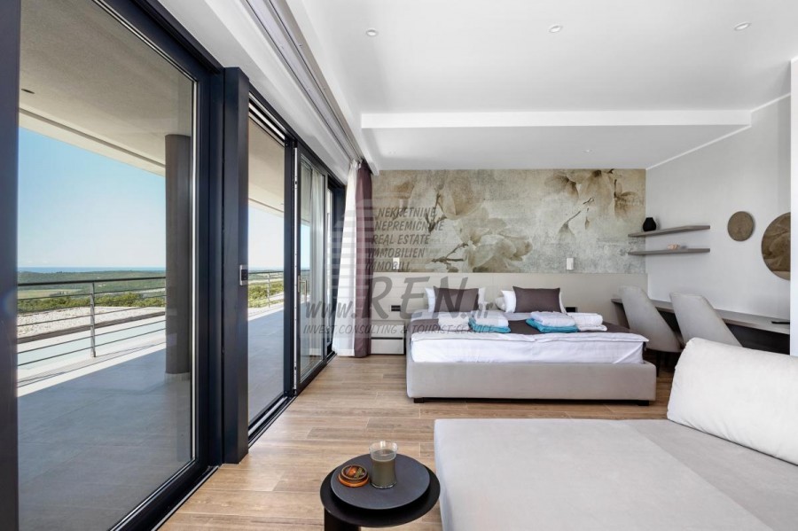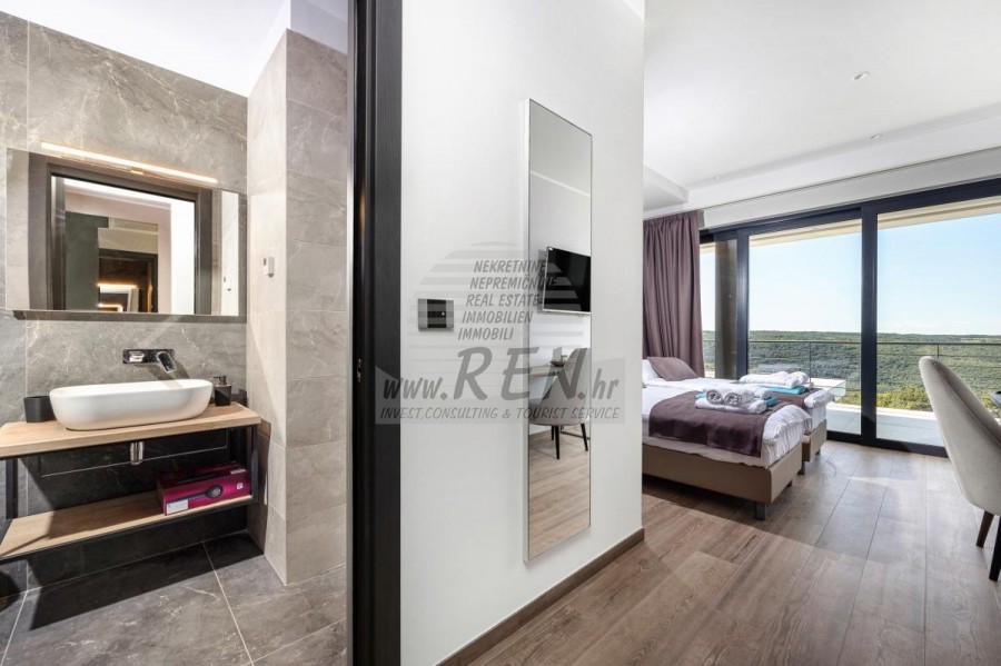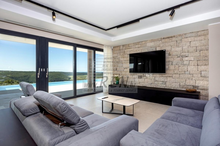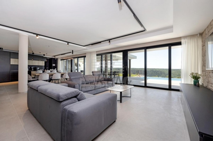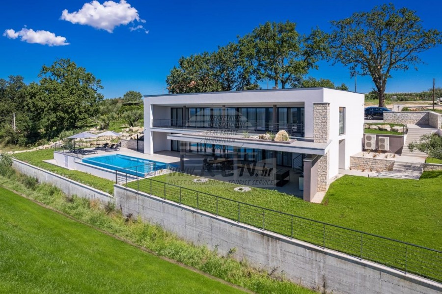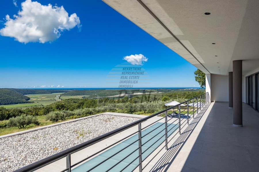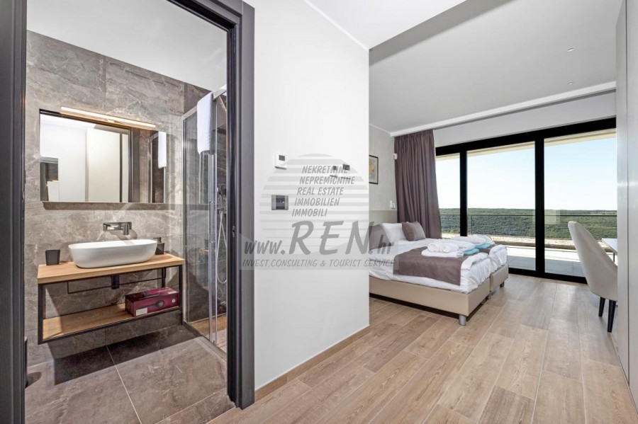 Luksuzne nekretnine Istra, prodajem modernu Vilu, okolica Buja Luksuzna villa s jednim od najljepših pogleda u Istri nalazi se u mirnom i malom mjestu u okolici Buja, iz kojeg se pruža čaroban pogled od planine Učke, rijeke Mirne i mora te čak do Alpa. Plivajući u bazenu dužine 14 m možete uživati u pogledu na dolinu rijeke Mirne, lovište i Motovunsku šumu poznatu po čuvenom Istarskom tartufu. Kompletno imanje od 1700 m2 ograđeno i udaljeno od ostalih kuća. Te je okruženo maslinikom. Imanje je novo sagrađeno u skladu sa ekološkim standardima, isključivo sa prirodnim materijalima kao što je kamen/drvo, okućnica je uređena isključivo sa domaćim biljkama, masline. Vila ima 6 spavaće sobe sa pripadajućim kupaonicama, a iz svih se pruža prekrasan pogled na more. Dnevni dio prostire se na 100m2, te obuhvaća luksuznu kuhinju sa otokom opremljenu najmodernijom suvremenom tehnologijom… tu je i blagovaonica sa kaminom, kao i dnevni boravak sa prekrasnim pogledom na more, te ima dvoja francuska vrata koje vode na vanjsku terasu, sunčalište, bazen, ljetnu kuhinju i travnjak. U nastavku dnevnog boravka nalazi se Wellness te fitnes iz kojih se također pruža prekrasan pogled. Sav namještaj potpisuju dizajneri i rađen je po mjeri. Objek je opremljen sa najsuvremenijim sistemom centralnog grijanja i hlađenja, kao i solarnim panelima, a sve kupaonice imaju i podna grijanja. Bazen osim sunčališta, očaravajućih pogleda, mira nudi i posebno veliki vanjski tuš. Na imanju se nalazi i parking za pet automobila, kao i svi dodatni sadržaji kao što su; vanjski roštilj. Za dodatne informacije stojimo Vam na raspolaganju.