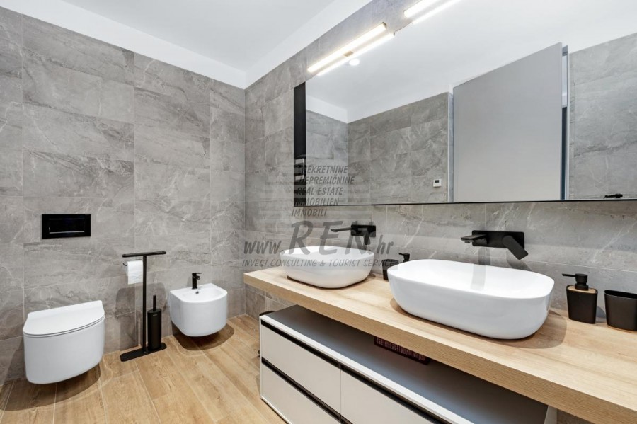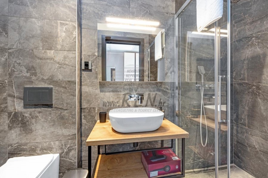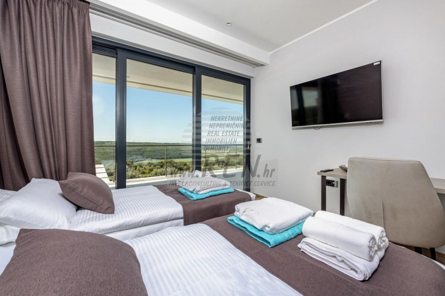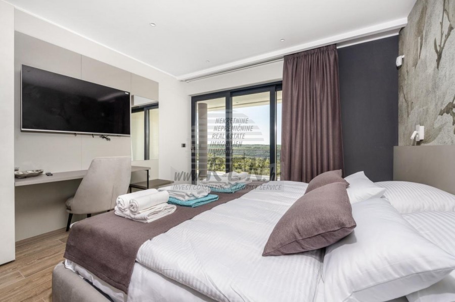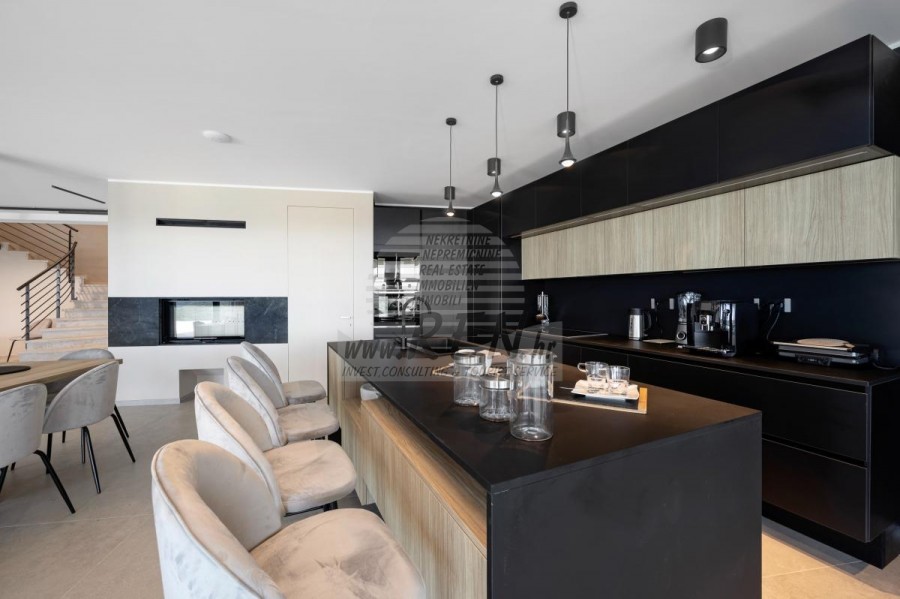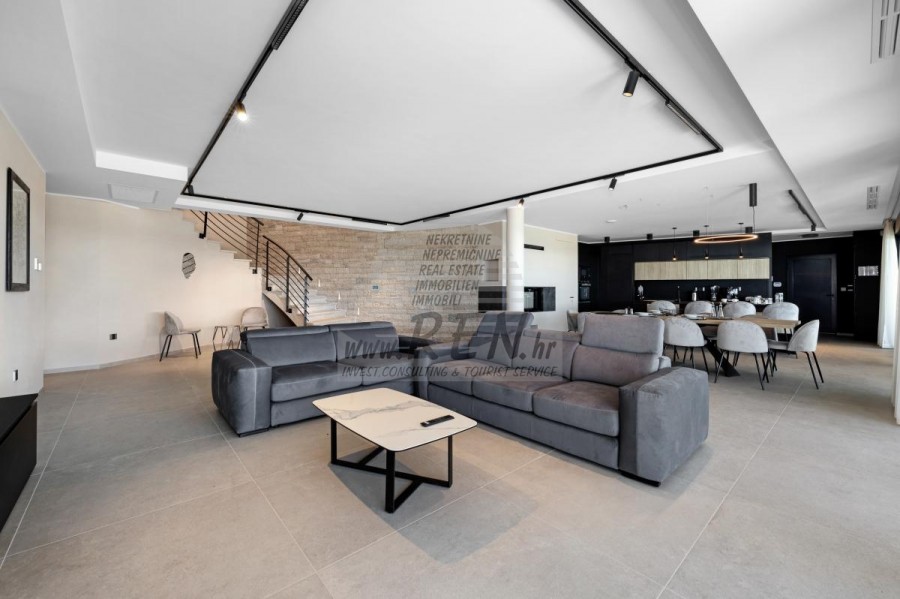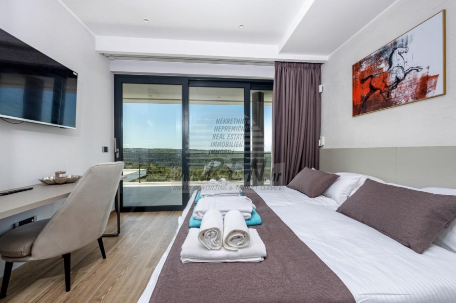 Luksuzne nekretnine Istra, prodajem modernu Vilu, okolica Buja Luksuzna villa s jednim od najljepših pogleda u Istri nalazi se u mirnom i malom mjestu u okolici Buja, iz kojeg se pruža čaroban pogled od planine Učke, rijeke Mirne i mora te čak do Alpa. Plivajući u bazenu dužine 14 m možete uživati u pogledu na dolinu rijeke Mirne, lovište i Motovunsku šumu poznatu po čuvenom Istarskom tartufu. Kompletno imanje od 1700 m2 ograđeno i udaljeno od ostalih kuća. Te je okruženo maslinikom. Imanje je novo sagrađeno u skladu sa ekološkim standardima, isključivo sa prirodnim materijalima kao što je kamen/drvo, okućnica je uređena isključivo sa domaćim biljkama, masline. Vila ima 6 spavaće sobe sa pripadajućim kupaonicama, a iz svih se pruža prekrasan pogled na more. Dnevni dio prostire se na 100m2, te obuhvaća luksuznu kuhinju sa otokom opremljenu najmodernijom suvremenom tehnologijom… tu je i blagovaonica sa kaminom, kao i dnevni boravak sa prekrasnim pogledom na more, te ima dvoja francuska vrata koje vode na vanjsku terasu, sunčalište, bazen, ljetnu kuhinju i travnjak. U nastavku dnevnog boravka nalazi se Wellness te fitnes iz kojih se također pruža prekrasan pogled. Sav namještaj potpisuju dizajneri i rađen je po mjeri. Objek je opremljen sa najsuvremenijim sistemom centralnog grijanja i hlađenja, kao i solarnim panelima, a sve kupaonice imaju i podna grijanja. Bazen osim sunčališta, očaravajućih pogleda, mira nudi i posebno veliki vanjski tuš. Na imanju se nalazi i parking za pet automobila, kao i svi dodatni sadržaji kao što su; vanjski roštilj. Za dodatne informacije stojimo Vam na raspolaganju.