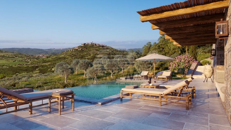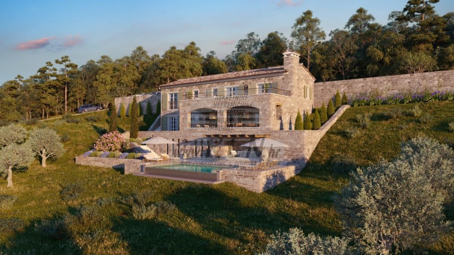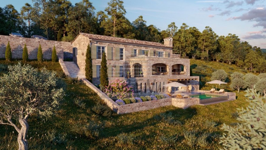 Luksuzne nekretnine Istra, prodajem projekt kamene Vile, Motovun Zemljište sa dozvolom za gradnju. Veliko seosko imanje sa 4 spavaće sobe, 1.900 m² zemljišta s maslinikom, kućicom uz bazen i infinity bazenom. Smještena među vinogradima i poljima i dolazi s puno privatnosti te lijepim pogledom na brežuljke. 5km od Motovuna. Ima oko 250 m2 neto stambene površine, 4 spavaće sobe s en-suite kupaonicama, kućicu uz bazen s kupaonicom i ljetnom kuhinjom, 1.900 m2 zemljišta i 32 m2 infinity bazena. Kuća je udaljena 1000 m od trgovine, 1000 m udaljena je od restorana, 1000 m udaljena je od tržnice, doktor je udaljen 1000 m, apoteka je udaljena 1000 m, aerodrom Pula udaljen je 60 km, te aerodrom Portorož udaljen je 30 km, marina Novigrad 20000 m. Za dodatne informacije stojimo Vam na raspolaganju.