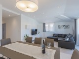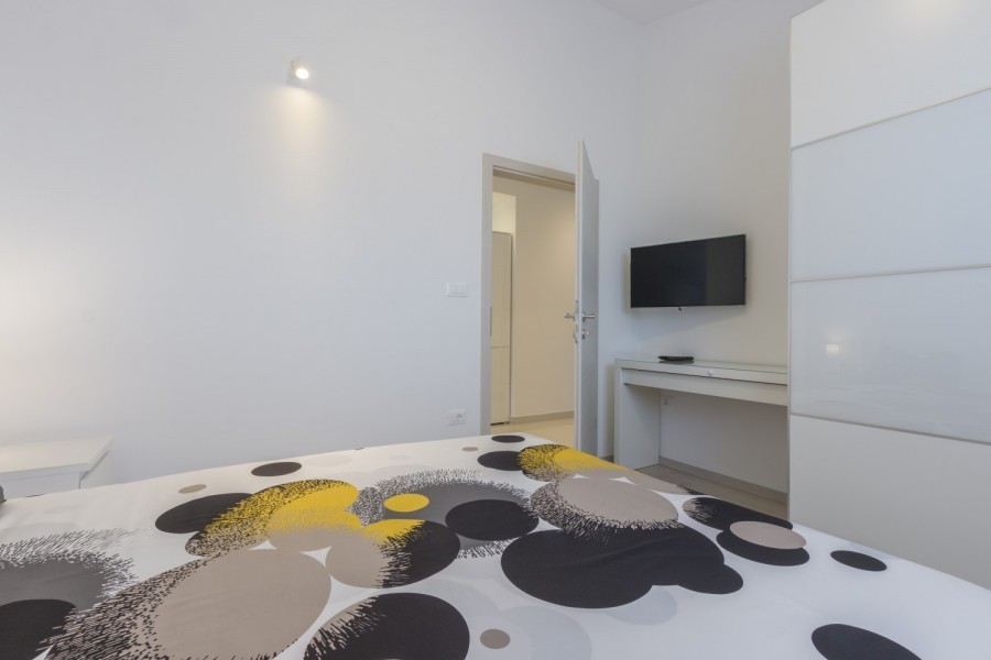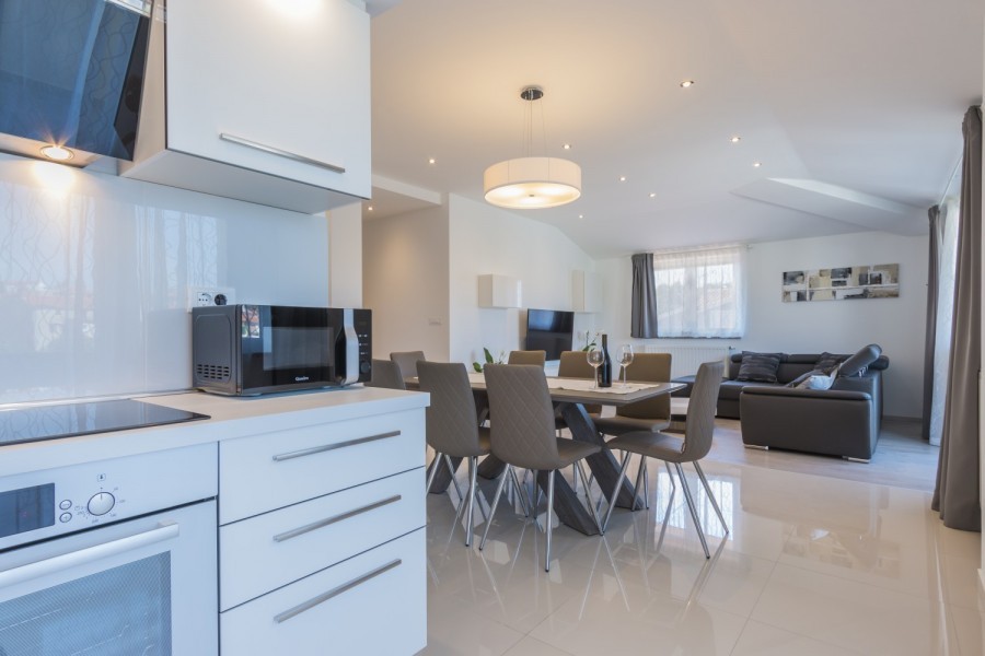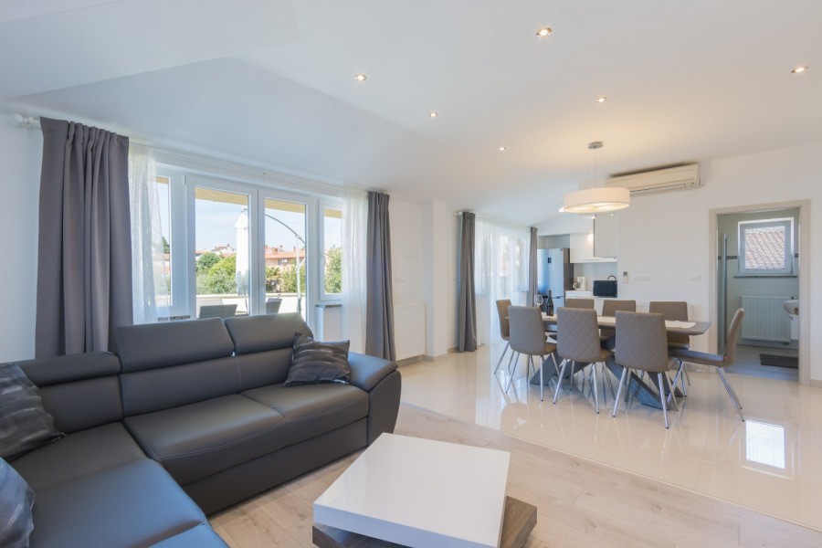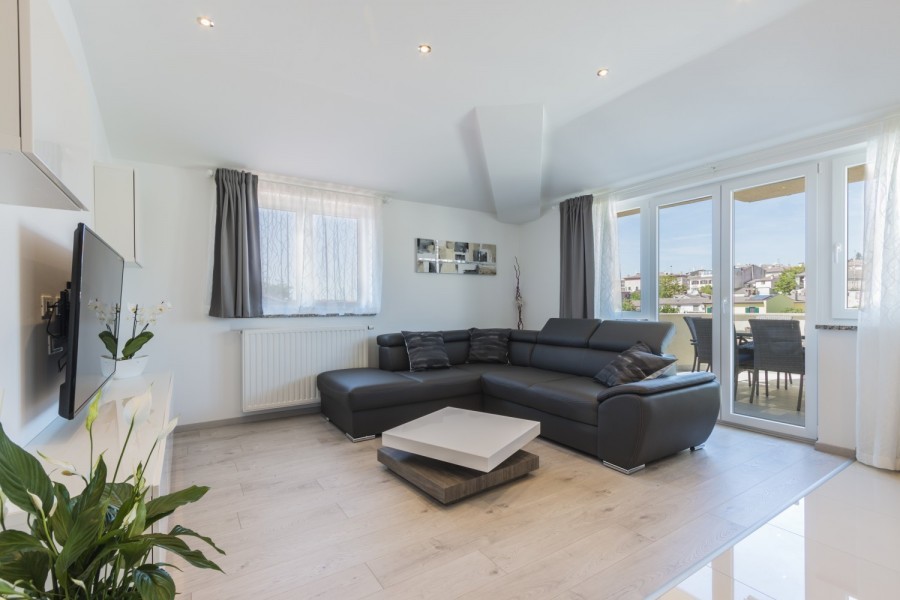 Na izvrsnoj lokaciji u Medulinu, prodaje se prostran i moderno opremljen stan od 95 m2. Stan je smješten na drugom katu manje, višestanbene zgrade, a udaljen svega nekolika minuta hoda od šetnice, rive, plaža i ostalih sadržaja. Stan se sastoji od hodnika,, 2 spavaće sobe, 2 velike kupaone , dnevnog i boravka s blagovaonom i kuhinjom, te velike terase. Kuhinja je u potpunosti opremljena, uključujući i svu aparaturu(perilicu za suđe, indukcijsku i mikrovalnu pećnicu). Sve prostorije u stanu su opremljene i namještene, kvalitetno i moderno, a posebnost mu daje pomno birana rasvjeta, koja stvara ugodnu atmosferu cijelom prostoru. U stanu je provedeno etažno plinsko grijanje, a halđenje je pomoću klima uređaja. Stanu pripada i spremiše u tavanskom dijelu stana, kao i 1 parkirno mjesto.