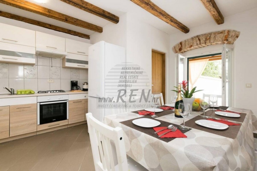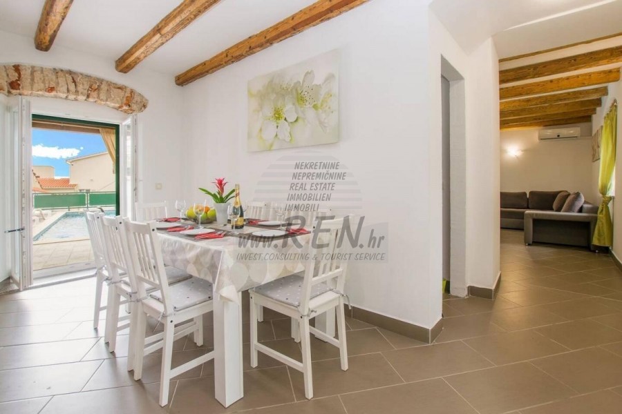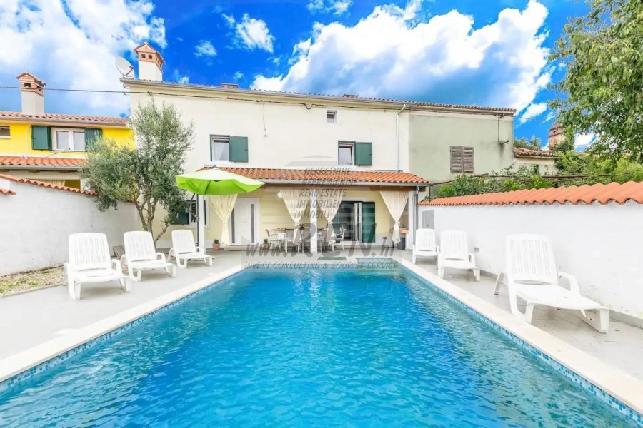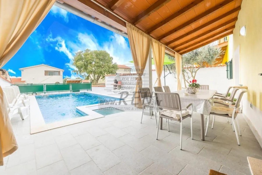 Nekretnine Istra, prodajem kuću sa bazenom, Pula Prodaje se kuća u nizu na mirnoj lokaciji blizu Pule. Kuća ima 130 m2 te se sastoji od natkrivenog ulaza, ulaznog hodnika, praone, 3 spavaće sobe od koje 2 imaju svoje privatno kupatilo i open space prostor u kojem se nalazi kuhinja s blagovaonicom te dnevni boravak s izlazom na natkrivenu terasu i vrt. Kuća ima bazen i dvorište od 150 m2. Svaka prostorija u kući opremljena je klima uređajem (ukupno 4). Kuća je kompletno namještena. 2 i više parking mjesta. Udaljenost od mora i lijepo uređene plaže je 4 km, a centar Pule 3 km. Kuću je moguće koristiti u stambene ili turističke svrhe. Kuća je udaljena svega 1500 m od trgovine, 2000 m udaljena je od restorana, doktor je udaljen 3000 m, apoteka je udaljena 3000 m, aerodrom Pula udaljen je 3 km, marina Pula 3 km. Za dodatne informacije stojimo Vam na raspolaganju.