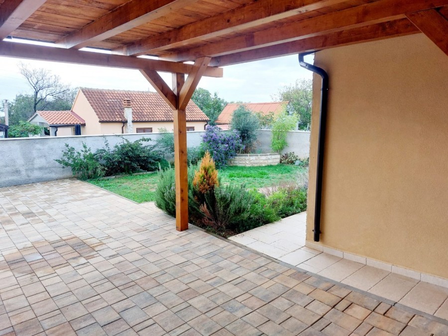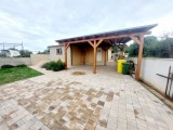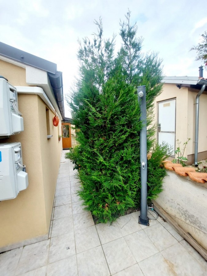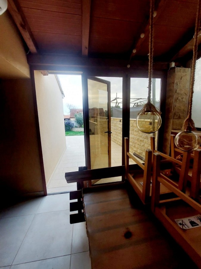 Na mirnoj lokaciji u Medulinu, samo 800 m od mora, smjestila se ova šarmantna kuća okružena prirodom i zelenilom. Na pomno uređenoj okućnici od 300 m2 su smješteni vanjski tuš, popločani dio zemljišta s natkrivenim parkingom za više automobila, te zeleni pojas oplemenjen mediteranskim raslinjem i vanjski tuš. Kuća se sastoji od dnevnog boravka s kuhinjom, prostrane kupaone, 2 spavaće sobe, te ljetne kuhinje s kaminom i velikim prostorom za zabavu. Kuća je u potpunosti namještena i opremljena, te se kao takva i prodaje. Vanjsko stubište vodi do prostrane krovne terase s predivnim pogledom na more. Ne propustite!