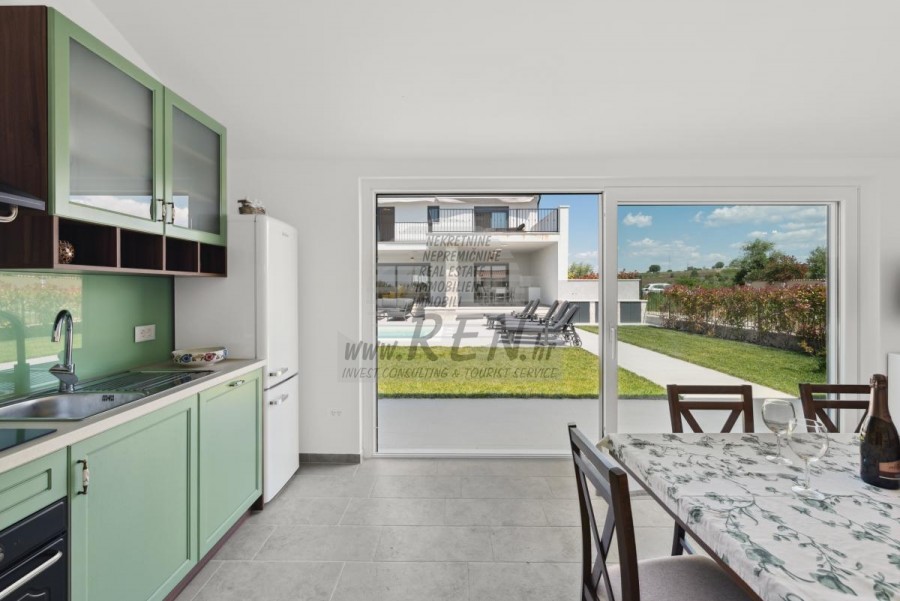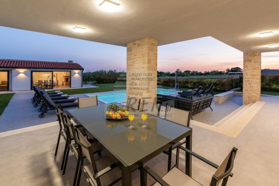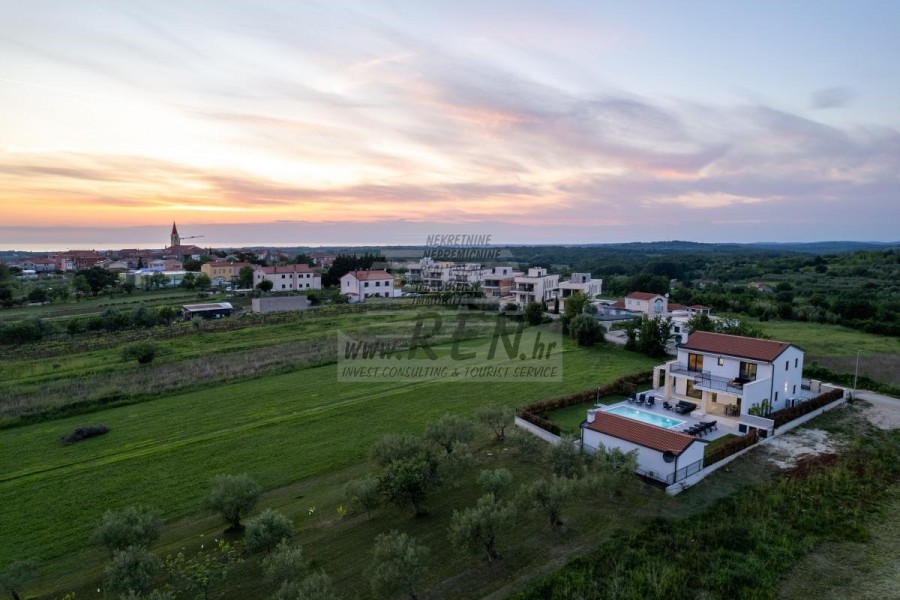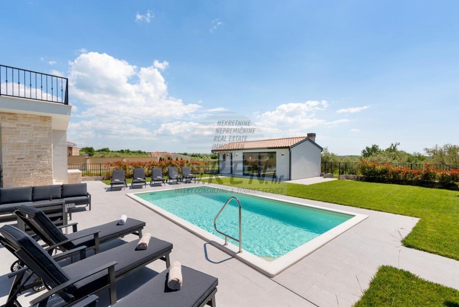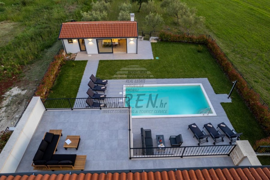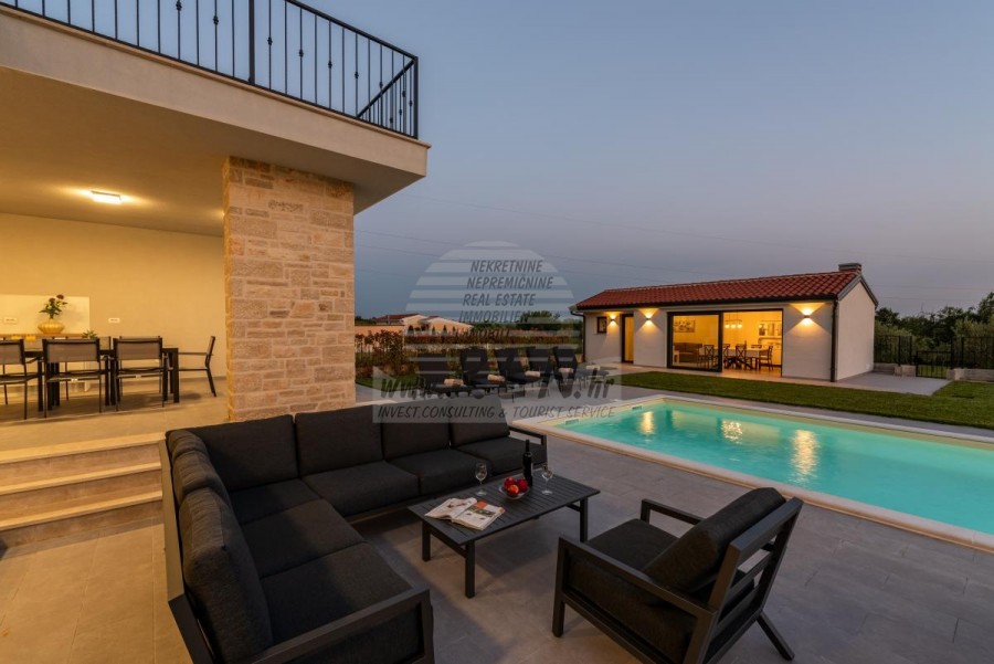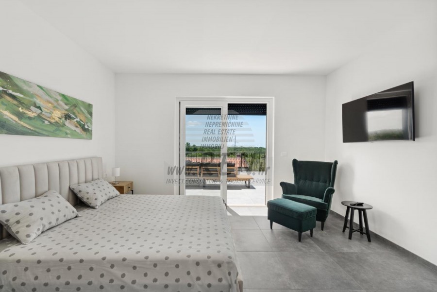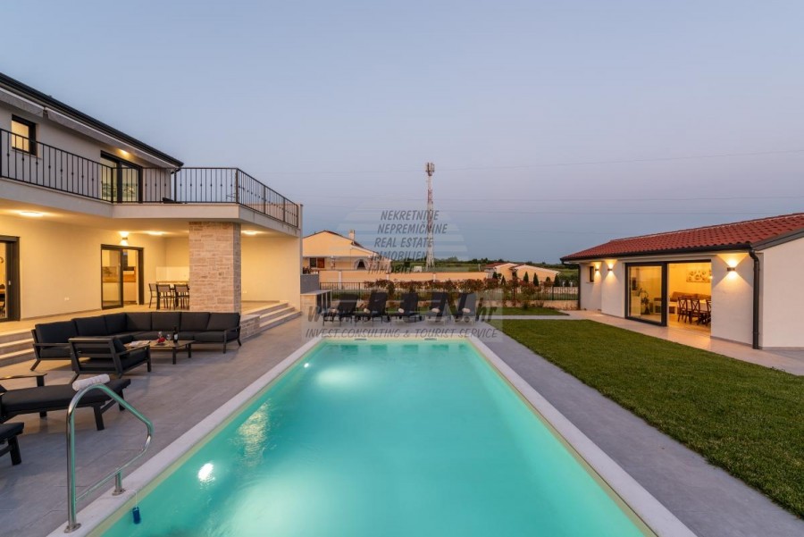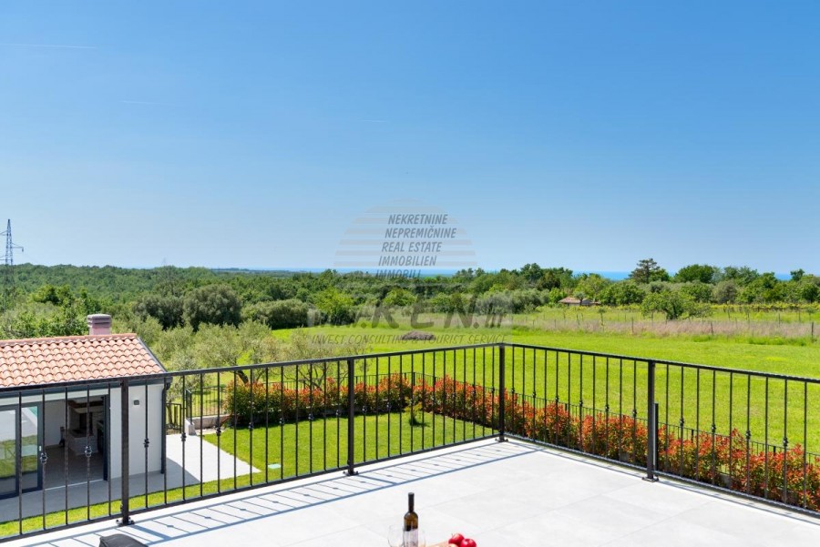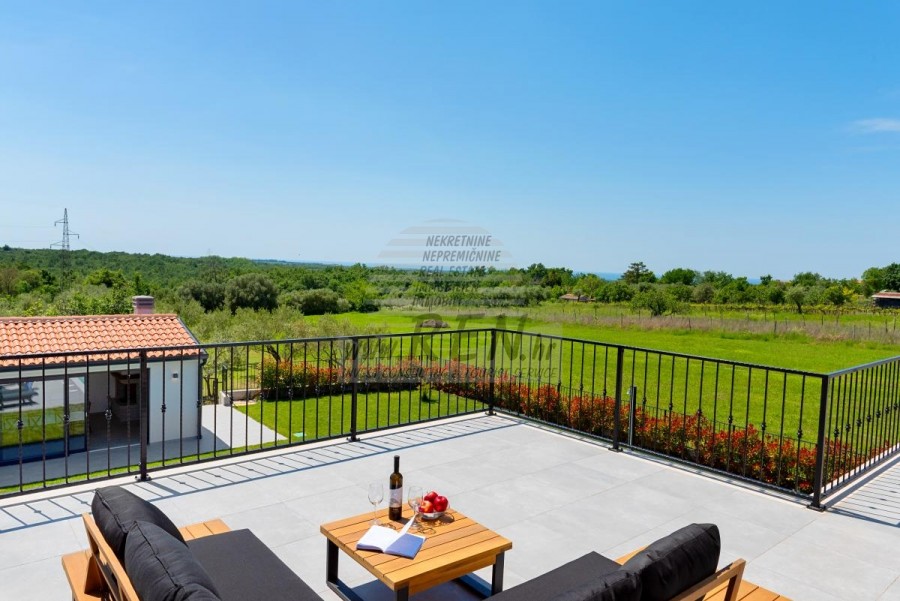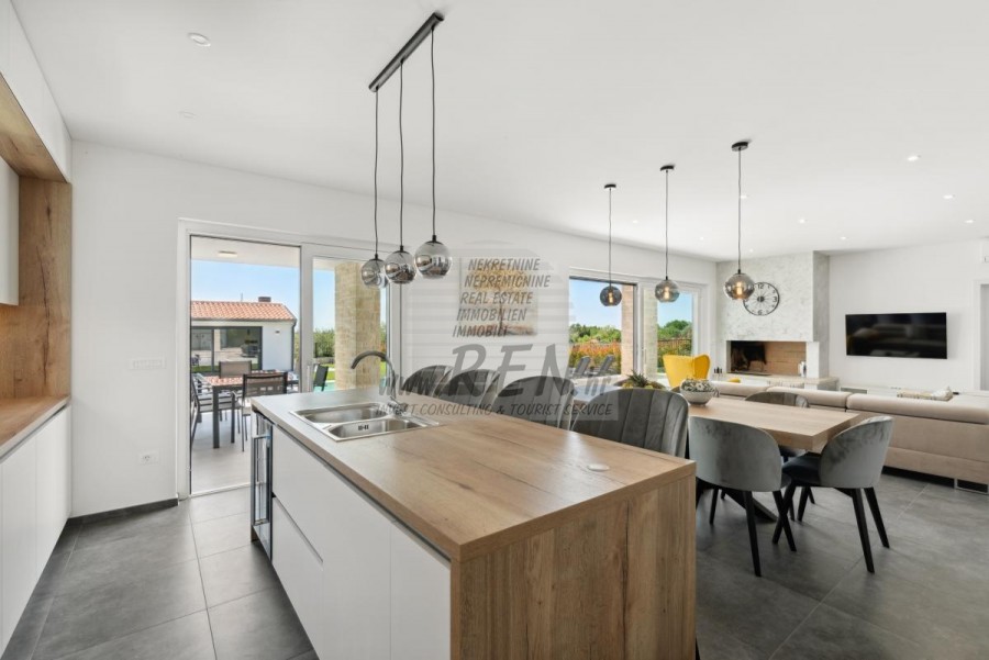 Luksuzna vila s bazenom u Brtonigli – Mediteranski san okružen zelenilom i morem U srcu istarskog mira, u čarobnom mjestu Brtonigla, nalazi se ova raskošna vila koja kombinira moderni komfort s autentičnim mediteranskim štihom. Smještena na prostranom zemljištu od 3350 m², okružena maslinicima, vinogradima i voćkama, pruža potpunu privatnost i harmoniju s prirodom, dok se istovremeno nude spektakularni vidici na more. Elegantan prostor za život i odmor Glavna kuća, zajedno s pomoćnim objektom, čini ukupno 290 m² prostranog i pažljivo dizajniranog stambenog prostora. U prizemlju se nalazi jedna od tri spavaće sobe, idealna za goste ili starije članove obitelji, dok su preostale dvje smještene na katu, sve opremljene vlastitim kupatilom za maksimalnu udobnost. Dnevni boravak, prostran i pun svjetla, centar je kuće – s toplim kaminom, modernom otvorenom kuhinjom i direktnim pristupom velikoj terasi s kojeg se pruža nezaboravan pogled na more. Klimatizacija i podno grijanje osiguravaju savršenu temperaturu tijekom cijele godine. Osim glavne kuhinje u dnevnom boravku, vila nudi još tri dodatne kuhinje koje čine ovaj prostor idealnim za ugostiteljske potrebe ili velike obiteljske okupljanja. Jedna se nalazi u pomoćnom objektu zajedno s blagovaonicom, druga je smještena na natkrivenoj terasi u prizemlju, dok treća kuhinja čeka u samom dvorištu, omogućavajući lagano pripremanje roštilja i društvenih fešta na otvorenom. Pomoćni objekt za dodatnu funkcionalnost U neposrednoj blizini glavne kuće nalazi se pomoćni objekt, koji nudi dodatnu kuhinju, blagovaonicu i kupatilo, što ga čini idealnim za goste, kućnu pomoć ili kao prostor za ugostiteljsku djelatnost. Oaza za relaksaciju i zabavu Vanjska sredina vile je pravi oaza za opuštanje. Bazen s elektrolizom osigurava čistoću vode bez iritantnih kemikalija, dok okolni sunčani terasi i zelenilo pozivaju na dugotrajno kupanje i uživanje u toplim danima. Za najmlađe je osigurano dječje igralište, dok će ljubitelji prirode cijeniti voćnjak i masline koje krasaju imanje. Idealna investicija u najam Vila je potpuno opremljena i uključena u sustav najma, što je čini izvrsnom prilikom za one koji žele kombinaciju luksuznog odmora i isplative investicije. Blizina mora, istaknuti turistički sadržaji Istre i mir Brtonigle čine je vrlo traženom destinacijom. Ova vila nije samo kuća – to je mediteranski san u kojem se svaki detalj brine o udobnosti, estetici i spoju s prirodom, pružajući vlasniku ili gostu nezaboravno iskustvo življenja u Istri.