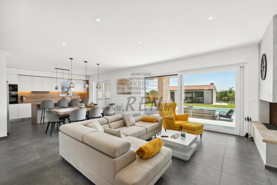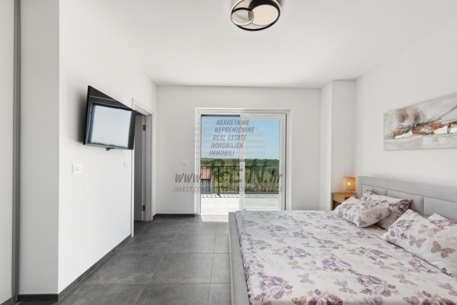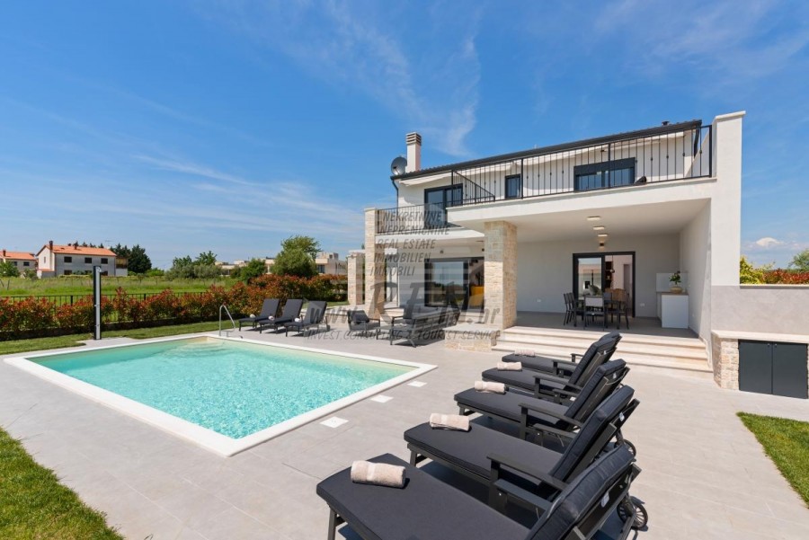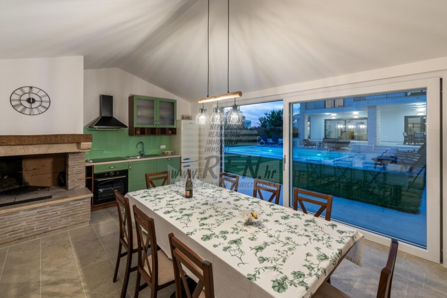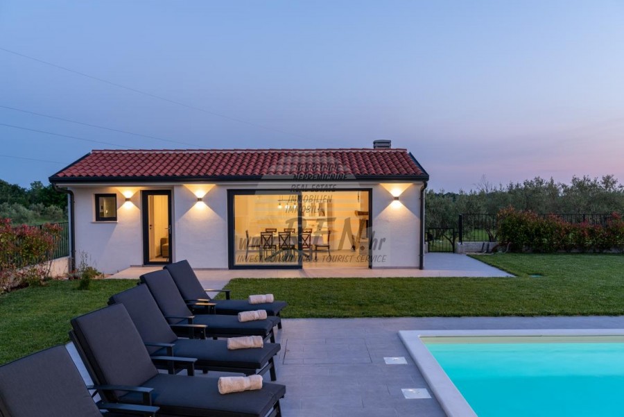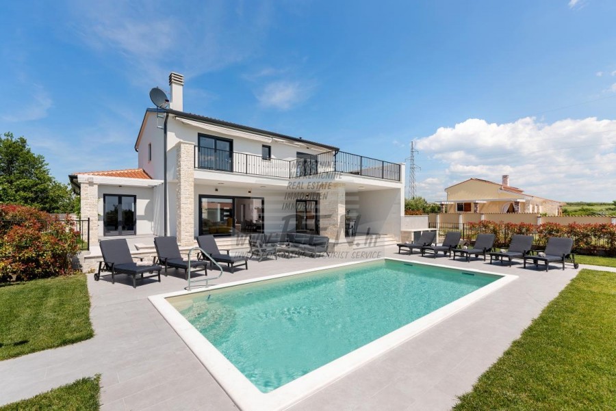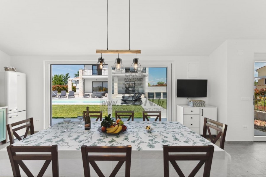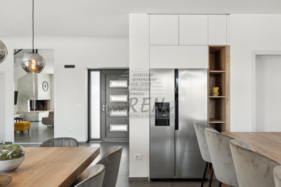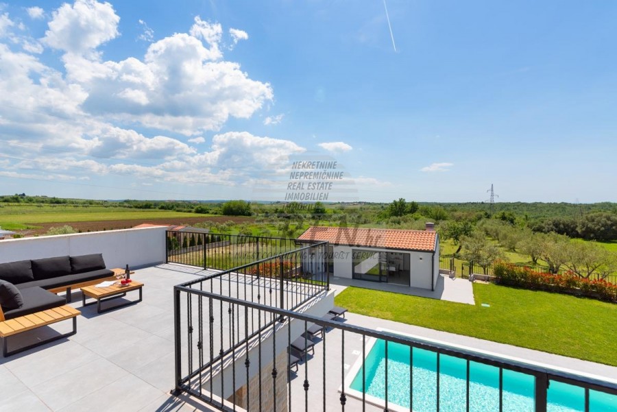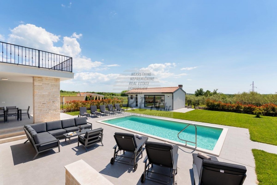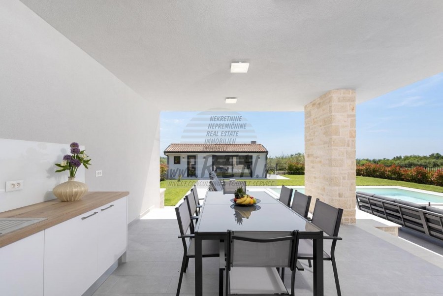 Luksuzna vila s bazenom u Brtonigli – Mediteranski san okružen zelenilom i morem U srcu istarskog mira, u čarobnom mjestu Brtonigla, nalazi se ova raskošna vila koja kombinira moderni komfort s autentičnim mediteranskim štihom. Smještena na prostranom zemljištu od 3350 m², okružena maslinicima, vinogradima i voćkama, pruža potpunu privatnost i harmoniju s prirodom, dok se istovremeno nude spektakularni vidici na more. Elegantan prostor za život i odmor Glavna kuća, zajedno s pomoćnim objektom, čini ukupno 290 m² prostranog i pažljivo dizajniranog stambenog prostora. U prizemlju se nalazi jedna od tri spavaće sobe, idealna za goste ili starije članove obitelji, dok su preostale dvje smještene na katu, sve opremljene vlastitim kupatilom za maksimalnu udobnost. Dnevni boravak, prostran i pun svjetla, centar je kuće – s toplim kaminom, modernom otvorenom kuhinjom i direktnim pristupom velikoj terasi s kojeg se pruža nezaboravan pogled na more. Klimatizacija i podno grijanje osiguravaju savršenu temperaturu tijekom cijele godine. Osim glavne kuhinje u dnevnom boravku, vila nudi još tri dodatne kuhinje koje čine ovaj prostor idealnim za ugostiteljske potrebe ili velike obiteljske okupljanja. Jedna se nalazi u pomoćnom objektu zajedno s blagovaonicom, druga je smještena na natkrivenoj terasi u prizemlju, dok treća kuhinja čeka u samom dvorištu, omogućavajući lagano pripremanje roštilja i društvenih fešta na otvorenom. Pomoćni objekt za dodatnu funkcionalnost U neposrednoj blizini glavne kuće nalazi se pomoćni objekt, koji nudi dodatnu kuhinju, blagovaonicu i kupatilo, što ga čini idealnim za goste, kućnu pomoć ili kao prostor za ugostiteljsku djelatnost. Oaza za relaksaciju i zabavu Vanjska sredina vile je pravi oaza za opuštanje. Bazen s elektrolizom osigurava čistoću vode bez iritantnih kemikalija, dok okolni sunčani terasi i zelenilo pozivaju na dugotrajno kupanje i uživanje u toplim danima. Za najmlađe je osigurano dječje igralište, dok će ljubitelji prirode cijeniti voćnjak i masline koje krasaju imanje. Idealna investicija u najam Vila je potpuno opremljena i uključena u sustav najma, što je čini izvrsnom prilikom za one koji žele kombinaciju luksuznog odmora i isplative investicije. Blizina mora, istaknuti turistički sadržaji Istre i mir Brtonigle čine je vrlo traženom destinacijom. Ova vila nije samo kuća – to je mediteranski san u kojem se svaki detalj brine o udobnosti, estetici i spoju s prirodom, pružajući vlasniku ili gostu nezaboravno iskustvo življenja u Istri.
