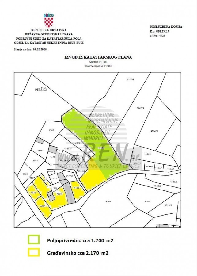 Kamena istarska kuća s velikim zemljištem – Oprtalj Na prodaju je autentična istarska kamena kuća smještena u mirnom i prirodnom okruženju, svega 2 km od Oprtlja i 20 km od mora. Kuća ima ukupnu površinu od 315 m² i nalazi se na prostranom zemljištu od 4.000 m², od čega je 2.000 m² građevinsko zemljište, što pruža dodatne mogućnosti za gradnju ili proširenje. Objekt se prostire na više etaža i predstavlja odličnu priliku za adaptaciju u luksuznu vilu, kuću za odmor ili turistički projekt. Okružena je prirodom i zelenilom, što osigurava potpunu privatnost i autentičan istarski ugođaj. Velika parcela omogućuje izgradnju bazena, dodatnih objekata, maslinika ili uređenje prostranog vrta. Glavne prednosti: -kamena istarska kuća – 315 m² -zemljište 4.000 m² -2.000 m² građevinsko zemljište -mirna lokacija u prirodi -2 km od Oprtlja -20 km od mora Veliki potencijal za turistički projekt ili luksuznu vilu Idealna nekretnina za sve koji traže autentičnu istarsku kuću s velikim zemljištem i potencijalom za investiciju.