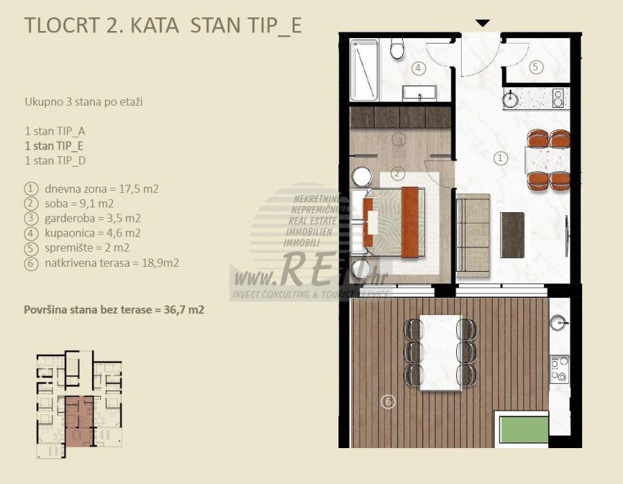 Appartamento 7B a Cittanova ha un totale di 36,7 m2 senza terrazza, si trova al secondo piano, fase di costruzione, 5 min. (1000m) dal mare e dalla bellissima spiaggia, a 5 min. (1000 m) dal centro di Cittanova. L'appartamento è composto da cucina/soggiorno/sala da pranzo, 1 camere da letto, 1 bagni, ripostiglo, guardaroba, terrazzo 18,9m2. Specifiche dell'appartamento: • Edificio ad efficienza energetica A o A+ • Ceramiche di classe I di maggiori dimensioni • Parquet in classe I di dimensioni maggiori • Porte antifurto e tagliafuoco • Sanitari Hansgrohe e Catalano • Videocitofono • Sistema di videosorveglianza all'ingresso • Smaltimento rifiuti recintato • Cancello pedonale d'ingresso • Cancello carrabile d'ingresso • Deposito per ogni appartamento • Spazio per le biciclette • Parcheggio interno • Posti auto coperti o garage • Riscaldamento a pavimento • Predisposizione per pannelli solari sul tetto • Predisposizione per caricabatterie per auto elettriche • Set di illuminazione esterna di appartamenti ed edifici • Ampio ingresso • Ascensore • Carpenteria in PVC/ALU • Rivestimenti in decking sui terrazzi • Copertura del soffitto del terrazzo • Predisposizione per la cucina sul terrazzo • Collegamento al caminetto • Scarico per ogni cappa con uscita sulla facciata o sul tetto • Irrigazione automatica dei green condivisi superficie • Irrigazione automatica delle aree verdi degli appartamenti in piano terra Riscaldamento e tramite sistema multisplit DAIKIN di unità interne ed esterne, pompe di circolazione per l'acqua calda in tutto l'appartamento, termostati individuali e controllo della temperatura per ogni stanza, controllo remoto dell'impianto di riscaldamento e raffrescamento tramite smartphone, unità esterne posizionate sul tetto dell'edificio, appartamenti al piano terra su superficie verde. Impianto videocitofonico a colori, cavo ottico consegnato in ogni appartamento. La garanzia sulla struttura è di 10 anni, per lavori edili e artigianali di 2 anni e per attrezzature e apparecchiature secondo i termini di garanzia del produttore. Per ulteriori informazioni stiamo alla vostra disposizione.